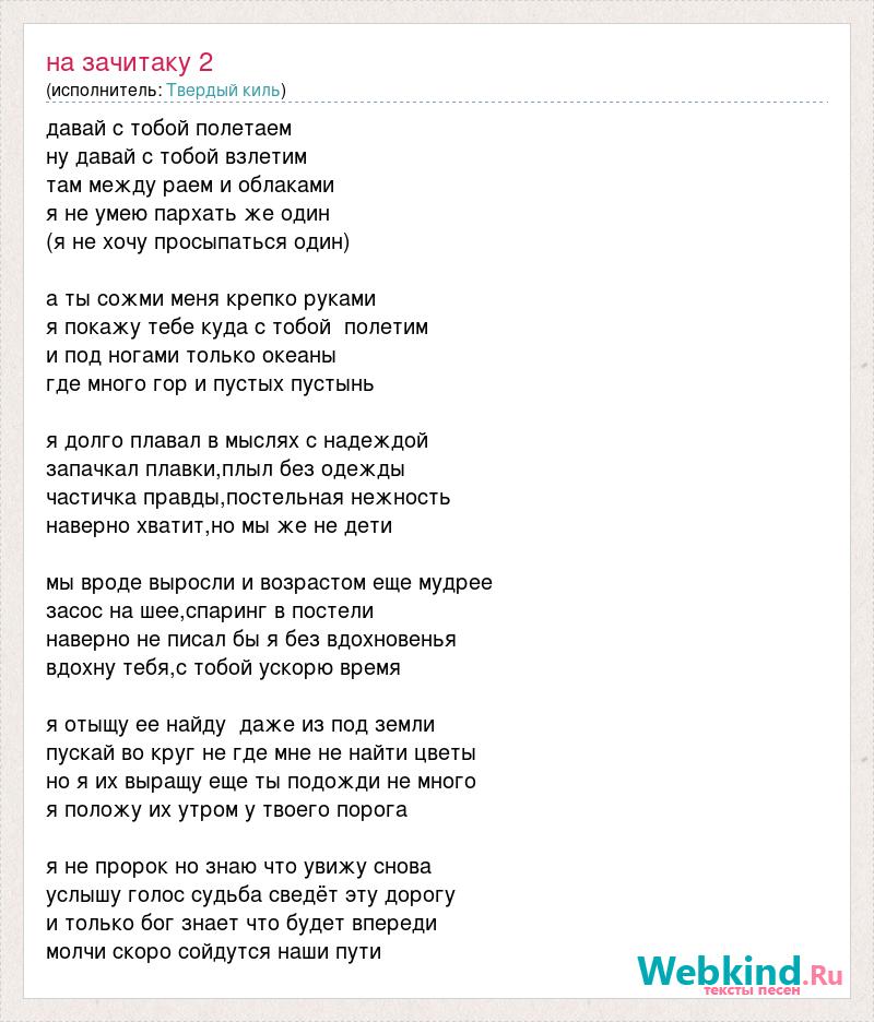 давай с тобой полетаем ну давай с тобой взлетим там между раем и облаками я не умею пархать же один (я не хочу просыпаться один) а ты сожми меня крепко руками я покажу тебе куда с тобой полетим и под ногами только океаны где много гор и пустых пустынь я долго плавал в мыслях с надеждой запачкал плавки,плыл без одежды частичка правды,постельная нежность наверно хватит,но мы же не дети мы вроде выросли и возрастом еще мудрее засос на шее,спаринг в постели наверно не писал бы я без вдохновенья вдохну тебя,с тобой ускорю время я отыщу ее найду даже из под земли пускай во круг не где мне не найти цветы но я их выращу еще ты подожди не много я положу их утром у твоего порога я не пророк но знаю что увижу снова услышу голос судьба сведёт эту дорогу и только бог знает что будет впереди молчи скоро сойдутся наши пути