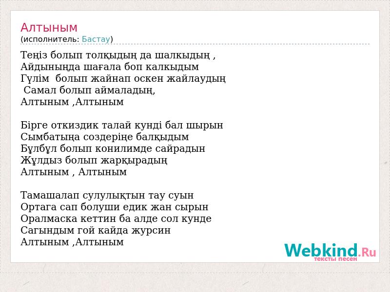Теңіз болып толқыдың да шалкыдың , Айдыныңда шағала боп калкыдым Гүлім болып жайнап оскен жайлаудың Самал болып аймаладың, Алтыным ,Алтыным Бірге откиздик талай кунді бал шырын Сымбатыңа создеріңе балқыдым Бұлбұл болып конилимде сайрадын Жұлдыз болып жарқырадың Алтыным , Алтыным Тамашалап сулулықтын тау суын Ортага сап болуши едик жан сырын Оралмаска кеттин ба алде сол кунде Сагындым гой кайда журсин Алтыным ,Алтыным