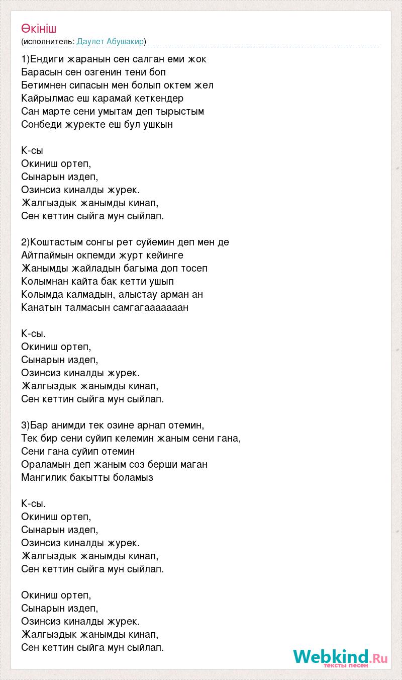 1)Ендиги жаранын сен салган еми жок Барасын сен озгенин тени боп Бетимнен сипасын мен болып октем жел Кайрылмас еш карамай кеткендер Сан марте сени умытам деп тырыстым Сонбеди журекте еш бул ушкын К-сы Окиниш ортеп, Сынарын издеп, Озинсиз киналды журек. Жалгыздык жанымды кинап, Сен кеттин сыйга мун сыйлап. 2)Коштастым сонгы рет суйемин деп мен де Айтпаймын окпемди журт кейинге Жанымды жайладын багыма доп тосеп Колымнан кайта бак кетти ушып Колымда калмадын, алыстау арман ан Канатын талмасын самгагааааааан К-сы. Окиниш ортеп, Сынарын издеп, Озинсиз киналды журек. Жалгыздык жанымды кинап, Сен кеттин сыйга мун сыйлап. 3)Бар анимди тек озине арнап отемин, Тек бир сени суйип келемин жаным сени гана, Сени гана суйип отемин Ораламын деп жаным соз берши маган Мангилик бакытты боламыз К-сы. Окиниш ортеп, Сынарын издеп, Озинсиз киналды журек. Жалгыздык жанымды кинап, Сен кеттин сыйга мун сыйлап. Окиниш ортеп, Сынарын издеп, Озинсиз киналды журек. Жалгыздык жанымды кинап, Сен кеттин сыйга мун сыйлап.