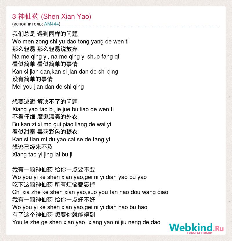 我们总是 遇到同样的问题 Wo men zong shi,yu dao tong yang de wen ti 那么轻易 那么轻易说放弃 Na me qing yi, na me qing yi shuo fang qi 看似简单 看似简单的事情 Kan si jian dan,kan si jian dan de shi qing 没有简单的事情 Mei you jian dan de shi qing 想要逃避 解决不了的问题 Xiang yao tao bi,jie jue bu liao de wen ti 不看仔细 魔鬼漂亮的外衣 Bu kan zi xi,mo gui piao liang de wai yi 看似甜蜜 毒药彩色的糖衣 Kan si tian mi,du yao cai se de tang yi 想逃已经来不及 Xiang tao yi jing lai bu ji 我有一颗神仙药 给你一点要不要 Wo you yi ke shen xian yao,gei ni yi dian yao bu yao 吃下这颗神仙药 所有烦恼都忘掉 Chi xia zhe ke shen xian yao,suo you fan nao dou wang diao 我有一颗神仙药 给你一点好不好 Wo you yi ke shen xian yao,gei ni yi dian hao bu hao 有了这个神仙药 想要你就能得到 You le zhe ge shen xian yao, xiang yao ni jiu neng de dao