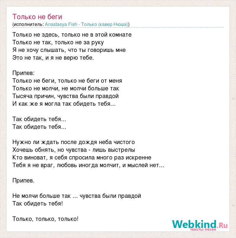 Только не здесь, только не в этой комнате Только не так, только не за руку Я не хочу слышать, что ты говоришь мне Это не так, и я не верю тебе. Припев: Только не беги, только не беги от меня Только не молчи, не молчи больше так Тысяча причин, чувства были правдой И как же я могла так обидеть тебя... Так обидеть тебя... Так обидеть тебя... Нужно ли ждать после дождя неба чистого Хочешь обнять, но чувства - лишь выстрелы Кто виноват, я себя спросила много раз искренне Тебя я не враг, любовь иногда молчит, и мыслей нет... Припев. Не молчи больше так ... чувства были правдой Так обидеть тебя! Только, только, только!