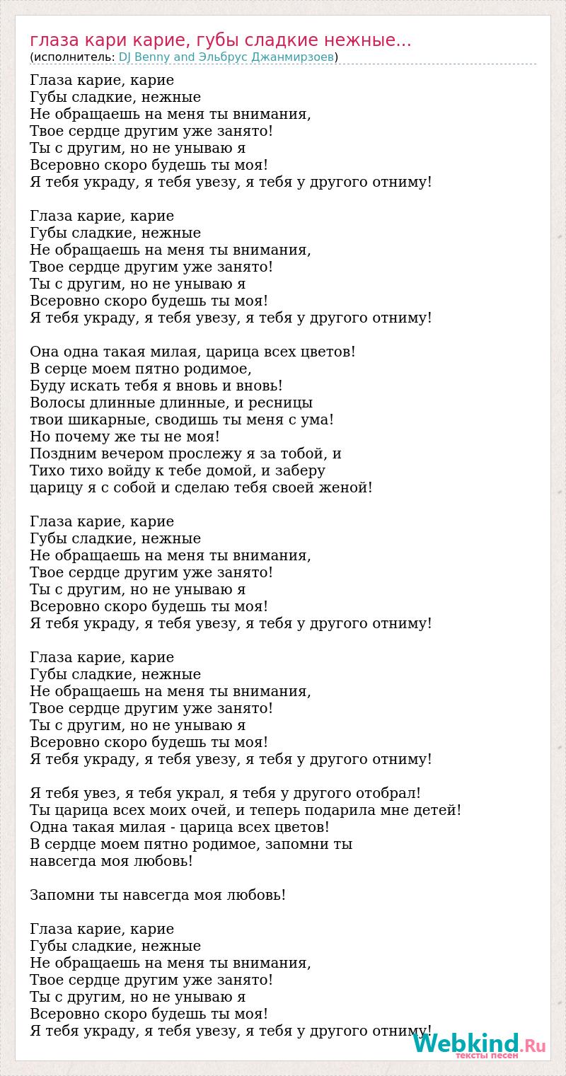 Глаза карие, карие Губы сладкие, нежные Не обращаешь на меня ты внимания, Твое сердце другим уже занято! Ты с другим, но не унываю я Всеровно скоро будешь ты моя! Я тебя украду, я тебя увезу, я тебя у другого отниму! Глаза карие, карие Губы сладкие, нежные Не обращаешь на меня ты внимания, Твое сердце другим уже занято! Ты с другим, но не унываю я Всеровно скоро будешь ты моя! Я тебя украду, я тебя увезу, я тебя у другого отниму! Она одна такая милая, царица всех цветов! В серце моем пятно родимое, Буду искать тебя я вновь и вновь! Волосы длинные длинные, и ресницы твои шикарные, сводишь ты меня с ума! Но почему же ты не моя! Поздним вечером прослежу я за тобой, и Тихо тихо войду к тебе домой, и заберу царицу я с собой и сделаю тебя своей женой! Глаза карие, карие Губы сладкие, нежные Не обращаешь на меня ты внимания, Твое сердце другим уже занято! Ты с другим, но не унываю я Всеровно скоро будешь ты моя! Я тебя украду, я тебя увезу, я тебя у другого отниму! Глаза карие, карие Губы сладкие, нежные Не обращаешь на меня ты внимания, Твое сердце другим уже занято! Ты с другим, но не унываю я Всеровно скоро будешь ты моя! Я тебя украду, я тебя увезу, я тебя у другого отниму! Я тебя увез, я тебя украл, я тебя у другого отобрал! Ты царица всех моих очей, и теперь подарила мне детей! Одна такая милая - царица всех цветов! В сердце моем пятно родимое, запомни ты навсегда моя любовь! Запомни ты навсегда моя любовь! Глаза карие, карие Губы сладкие, нежные Не обращаешь на меня ты внимания, Твое сердце другим уже занято! Ты с другим, но не унываю я Всеровно скоро будешь ты моя! Я тебя украду, я тебя увезу, я тебя у другого отниму!
