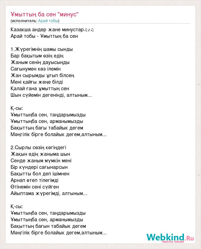 Казакша андер жане минустар♫♪♫ Арай тобы - Ұмыттың ба сен 1.Жүрегімнің шамы сынды Бар бақытым өзің едің Жаным сенің дауысыңды Сағынумен көз ілемін Жан сырымды ұғып білсең Мені қайғы жеңе білді Қалай ғана ұмыттың сен Шын сүйемін дегенінді, алтыным... Қ-сы: Ұмыттыңба сен, таңдарымызды Ұмыттыңба сен, арманымызды Бақыттың бағы табайык дегем Мәңгілік бірге болайык дегем,алтыным... 2.Сырлы сөзің көгіңдегі Жақын едің жаныма шын Сенде жаным мүмкін мені Бір күндері сағынарсын Бақытты бол деп ішімнен Арнап өтеп тілегімді Өтінемін сені сүйген Айыптама жүрегімді, алтыным... Қ-сы: Ұмыттыңба сен, таңдарымызды Ұмыттыңба сен, арманымызды Бақыттың бағын табайык дегем Мәңгілік бірге болайык дегем,алтыным...