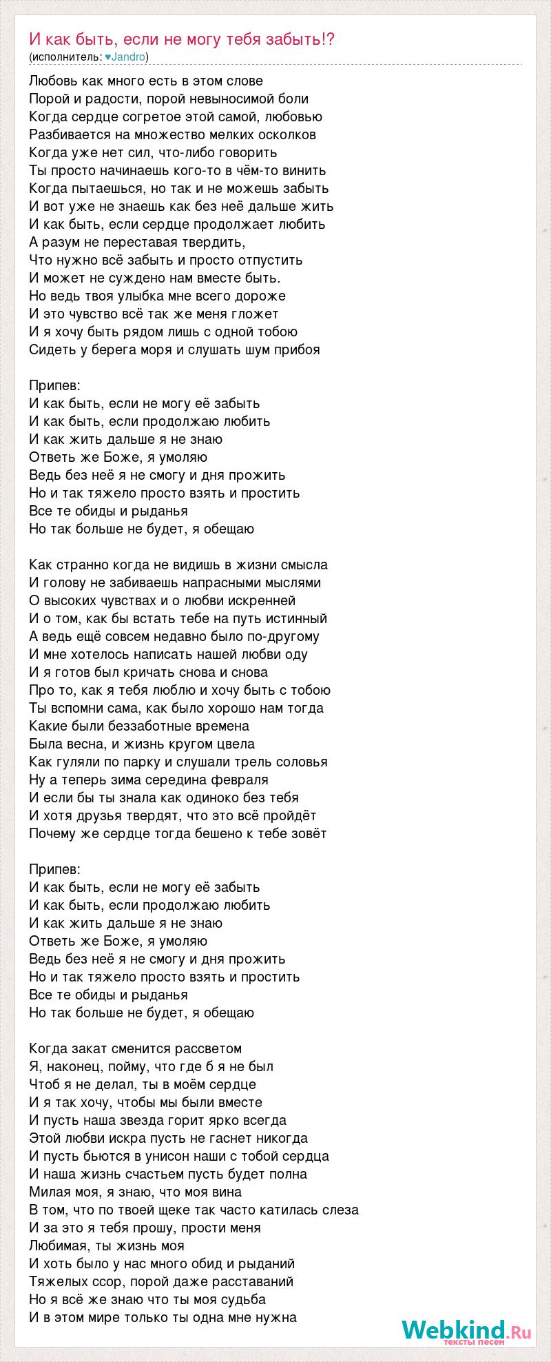Любовь как много есть в этом слове Порой и радости, порой невыносимой боли Когда сердце согретое этой самой, любовью Разбивается на множество мелких осколков Когда уже нет сил, что-либо говорить Ты просто начинаешь кого-то в чём-то винить Когда пытаешься, но так и не можешь забыть И вот уже не знаешь как без неё дальше жить И как быть, если сердце продолжает любить А разум не переставая твердить, Что нужно всё забыть и просто отпустить И может не суждено нам вместе быть. Но ведь твоя улыбка мне всего дороже И это чувство всё так же меня гложет И я хочу быть рядом лишь с одной тобою Сидеть у берега моря и слушать шум прибоя Припев: И как быть, если не могу её забыть И как быть, если продолжаю любить И как жить дальше я не знаю Ответь же Боже, я умоляю Ведь без неё я не смогу и дня прожить Но и так тяжело просто взять и простить Все те обиды и рыданья Но так больше не будет, я обещаю Как странно когда не видишь в жизни смысла И голову не забиваешь напрасными мыслями О высоких чувствах и о любви искренней И о том, как бы встать тебе на путь истинный А ведь ещё совсем недавно было по-другому И мне хотелось написать нашей любви оду И я готов был кричать снова и снова Про то, как я тебя люблю и хочу быть с тобою Ты вспомни сама, как было хорошо нам тогда Какие были беззаботные времена Была весна, и жизнь кругом цвела Как гуляли по парку и слушали трель соловья Ну а теперь зима середина февраля И если бы ты знала как одиноко без тебя И хотя друзья твердят, что это всё пройдёт Почему же сердце тогда бешено к тебе зовёт Припев: И как быть, если не могу её забыть И как быть, если продолжаю любить И как жить дальше я не знаю Ответь же Боже, я умоляю Ведь без неё я не смогу и дня прожить Но и так тяжело просто взять и простить Все те обиды и рыданья Но так больше не будет, я обещаю Когда закат сменится рассветом Я, наконец, пойму, что где б я не был Чтоб я не делал, ты в моём сердце И я так хочу, чтобы мы были вместе И пусть наша звезда горит ярко всегда Этой любви искра пусть не гаснет никогда И пусть бьются в унисон наши с тобой сердца И наша жизнь счастьем пусть будет полна Милая моя, я знаю, что моя вина В том, что по твоей щеке так часто катилась слеза И за это я тебя прошу, прости меня Любимая, ты жизнь моя И хоть было у нас много обид и рыданий Тяжелых ссор, порой даже расставаний Но я всё же знаю что ты моя судьба И в этом мире только ты одна мне нужна
