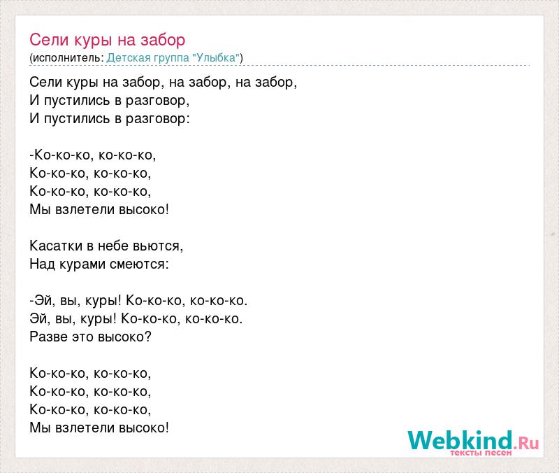 Сели куры на забор, на забор, на забор, И пустились в разговор, И пустились в разговор: -Ко-ко-ко, ко-ко-ко, Ко-ко-ко, ко-ко-ко, Ко-ко-ко, ко-ко-ко, Мы взлетели высоко! Касатки в небе вьются, Над курами смеются: -Эй, вы, куры! Ко-ко-ко, ко-ко-ко. Эй, вы, куры! Ко-ко-ко, ко-ко-ко. Разве это высоко? Ко-ко-ко, ко-ко-ко, Ко-ко-ко, ко-ко-ко, Ко-ко-ко, ко-ко-ко, Мы взлетели высоко!