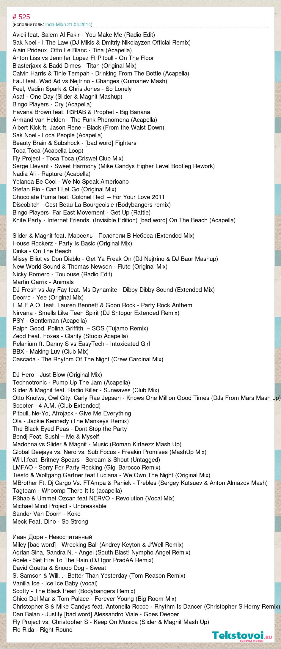Avicii feat. Salem Al Fakir - You Make Me (Radio Edit) Sak Noel - I The Law (DJ Mikis & Dmitriy Nikolayzen Official Remix) Alain Prideux, Otto Le Blanc - Tina (Acapella) Anton Liss vs Jennifer Lopez Ft Pitbull - On The Floor Blasterjaxx & Badd Dimes - Titan (Original Mix) Calvin Harris & Tinie Tempah - Drinking From The Bottle (Acapella) Faul feat. Wad Ad vs Nejtrino - Changes (Gumanev Mash) Feel, Vadim Spark & Chris Jones - So Lonely Asaf - One Day (Slider & Magnit Mashup) Bingo Players - Cry (Acapella) Havana Brown feat. R3HAB & Prophet - Big Banana Armand van Helden - The Funk Phenomena (Acapella) Albert Kick ft. Jason Rene - Black (From the Waist Down) Sak Noel - Loca People (Acapella) Beauty Brain & Subshock - Drunk Fighters Toca Toca (Acapella Loop) Fly Project - Toca Toca (Criswel Club Mix) Serge Devant - Sweet Harmony (Mike Candys Higher Level Bootleg Rework) Nadia Ali - Rapture (Acapella) Yolanda Be Cool - We No Speak Americano Stefan Rio - Can't Let Go (Original Mix) Chocolate Puma feat. Colonel Red – For Your Love 2011 Discobitch - Cest Beau La Bourgeoisie (Bodybangers remix) Bingo Players Far East Movement - Get Up (Rattle) Knife Party - Internet Friends (Invisible Edition) [bad word] On The Beach (Acapella) Slider & Magnit feat. Марсель - Полетели В Небеса (Extended Mix) House Rockerz - Party Is Basic (Original Mix) Dinka - On The Beach Missy Elliot vs Don Diablo - Get Ya Freak On (DJ Nejtrino & DJ Baur Mashup) New World Sound & Thomas Newson - Flute (Original Mix) Nicky Romero - Toulouse (Radio Edit) Martin Garrix - Animals DJ Fresh vs Jay Fay feat. Ms Dynamite - Dibby Dibby Sound (Extended Mix) Deorro - Yee (Original Mix) L.M.F.A.O. feat. Lauren Bennett & Goon Rock - Party Rock Anthem Nirvana - Smells Like Teen Spirit (DJ Shtopor Extended Remix) PSY - Gentleman (Acapella) Ralph Good, Polina Griffith – SOS (Tujamo Remix) Zedd Feat. Foxes - Clarity (Studio Acapella) Relanium ft. Danny S vs EasyTech - Intoxicated Girl BBX - Making Luv (Club Mix) Cascada - The Rhythm Of The Night (Crew Cardinal Mix) DJ Hero - Just Blow (Original Mix) Technotronic - Pump Up The Jam (Acapella) Slider & Magnit feat. Radio Killer - Sunwaves (Club Mix) Otto Knolws, Owl City, Carly Rae Jepsen - Knows One Million Good Times (DJs From Mars Mash up) Scooter - 4 A.M. (Club Extended) Pitbull, Ne-Yo, Afrojack - Give Me Everything Ola - Jackie Kennedy (The Mankeys Remix) The Black Eyed Peas - Dont Stop the Party Bendj Feat. Sushi – Me & Myself Madonna vs Slider & Magnit - Music (Roman Kirtaezz Mash Up) Global Deejays vs. Nero vs. Sub Focus - Freakin Promises (MashUp Mix) Will.I.feat. Britney Spears - Scream & Shout (Untagged) LMFAO - Sorry For Party Rocking (Gigi Barocco Remix) Tiesto & Wolfgang Gartner feat Luciana - We Own The Night (Original Mix) MBrother Ft. Dj Cargo Vs. FTAmpa & Paniek - Trebles (Sergey Kutsuev & Anton Almazov Mash) Tagteam - Whoomp There It Is (acapella) R3hab & Ummet Ozcan feat NERVO - Revolution (Vocal Mix) Michael Mind Project - Unbreakable Sander Van Doorn - Koko Meck Feat. Dino - So Strong Иван Дорн - Невоспитанный Miley Cyrus - Wrecking Ball (Andrey Keyton & J'Well Remix) Adrian Sina, Sandra N. - Angel (South Blast! Nympho Angel Remix) Adele - Set Fire To The Rain (DJ Igor PradAA Remix) David Guetta & Snoop Dog - Sweat S. Samson & Will.I.- Better Than Yesterday (Tom Reason Remix) Vanilla Ice - Ice Ice Baby (vocal) Scotty - The Black Pearl (Bodybangers Remix) Chico Del Mar & Tom Palace - Forever Young (Big Room Mix) Christopher S & Mike Candys feat. Antonella Rocco - Rhythm Is Dancer (Christopher S Horny Remix) Dan Balan - Justify [bad word] Alessandro Viale - Goes Deeper Fly Project vs. Christopher S - Keep On Musica (Slider & Magnit Mash Up) Flo Rida - Right Round