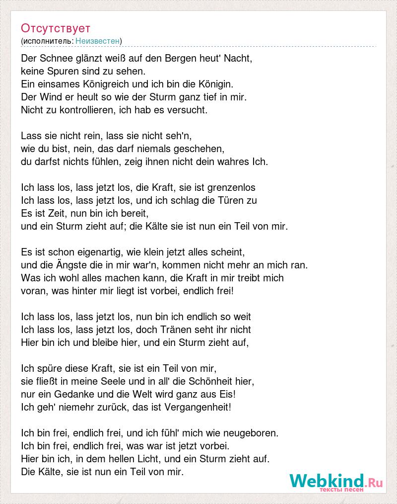 Der Schnee glänzt weiß auf den Bergen heut' Nacht, keine Spuren sind zu sehen. Ein einsames Königreich und ich bin die Königin. Der Wind er heult so wie der Sturm ganz tief in mir. Nicht zu kontrollieren, ich hab es versucht. Lass sie nicht rein, lass sie nicht seh'n, wie du bist, nein, das darf niemals geschehen, du darfst nichts fühlen, zeig ihnen nicht dein wahres Ich. Ich lass los, lass jetzt los, die Kraft, sie ist grenzenlos Ich lass los, lass jetzt los, und ich schlag die Türen zu Es ist Zeit, nun bin ich bereit, und ein Sturm zieht auf; die Kälte sie ist nun ein Teil von mir. Es ist schon eigenartig, wie klein jetzt alles scheint, und die Ängste die in mir war'n, kommen nicht mehr an mich ran. Was ich wohl alles machen kann, die Kraft in mir treibt mich voran, was hinter mir liegt ist vorbei, endlich frei! Ich lass los, lass jetzt los, nun bin ich endlich so weit Ich lass los, lass jetzt los, doch Tränen seht ihr nicht Hier bin ich und bleibe hier, und ein Sturm zieht auf, Ich spüre diese Kraft, sie ist ein Teil von mir, sie fließt in meine Seele und in all' die Schönheit hier, nur ein Gedanke und die Welt wird ganz aus Eis! Ich geh' niemehr zurück, das ist Vergangenheit! Ich bin frei, endlich frei, und ich fühl' mich wie neugeboren. Ich bin frei, endlich frei, was war ist jetzt vorbei. Hier bin ich, in dem hellen Licht, und ein Sturm zieht auf. Die Kälte, sie ist nun ein Teil von mir.