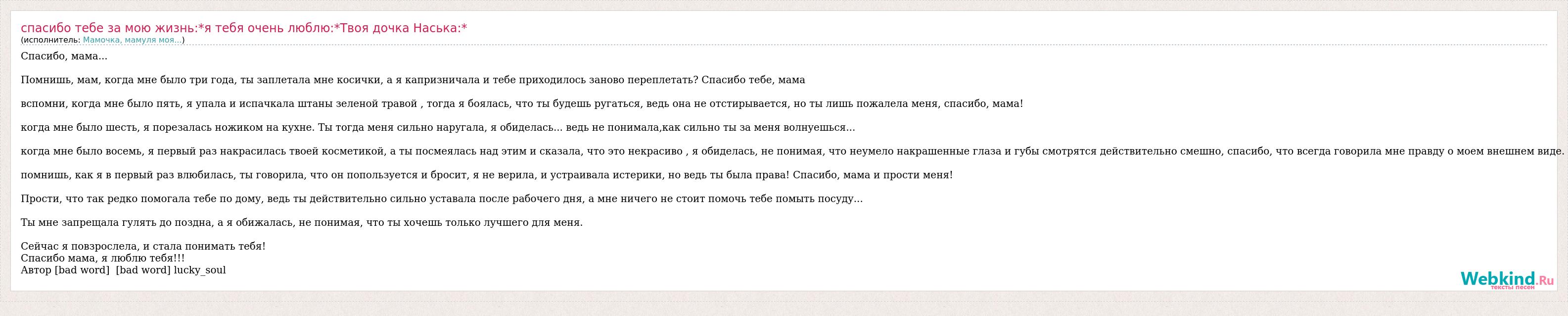 Спасибо, мама... Помнишь, мам, когда мне было три года, ты заплетала мне косички, а я капризничала и тебе приходилось заново переплетать? Спасибо тебе, мама вспомни, когда мне было пять, я упала и испачкала штаны зеленой травой , тогда я боялась, что ты будешь ругаться, ведь она не отстирывается, но ты лишь пожалела меня, спасибо, мама! когда мне было шесть, я порезалась ножиком на кухне. Ты тогда меня сильно наругала, я обиделась... ведь не понимала,как сильно ты за меня волнуешься... когда мне было восемь, я первый раз накрасилась твоей косметикой, а ты посмеялась над этим и сказала, что это некрасиво , я обиделась, не понимая, что неумело накрашенные глаза и губы смотрятся действительно смешно, спасибо, что всегда говорила мне правду о моем внешнем виде. помнишь, как я в первый раз влюбилась, ты говорила, что он попользуется и бросит, я не верила, и устраивала истерики, но ведь ты была права! Спасибо, мама и прости меня! Прости, что так редко помогала тебе по дому, ведь ты действительно сильно уставала после рабочего дня, а мне ничего не стоит помочь тебе помыть посуду... Ты мне запрещала гулять до поздна, а я обижалась, не понимая, что ты хочешь только лучшего для меня. Сейчас я повзрослела, и стала понимать тебя! Спасибо мама, я люблю тебя!!! Автор [bad word] [bad word] lucky_soul