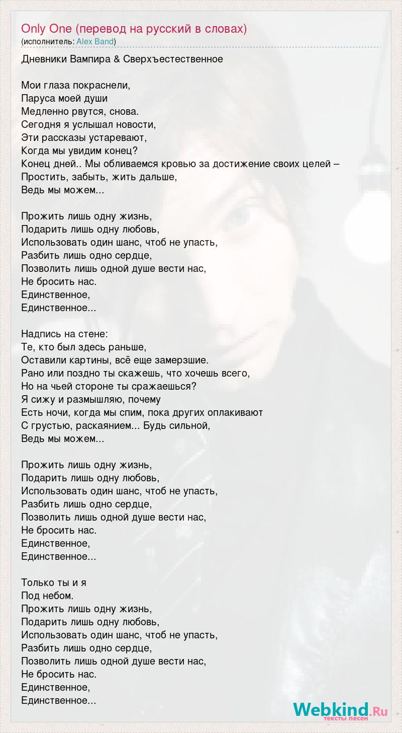 Дневники Вампира & Сверхъестественное Мои глаза покраснели, Паруса моей души Медленно рвутся, снова. Сегодня я услышал новости, Эти рассказы устаревают, Когда мы увидим конец? Конец дней.. Мы обливаемся кровью за достижение своих целей – Простить, забыть, жить дальше, Ведь мы можем... Прожить лишь одну жизнь, Подарить лишь одну любовь, Использовать один шанс, чтоб не упасть, Разбить лишь одно сердце, Позволить лишь одной душе вести нас, Не бросить нас. Единственное, Единственное... Надпись на стене: Те, кто был здесь раньше, Оставили картины, всё еще замерзшие. Рано или поздно ты скажешь, что хочешь всего, Но на чьей стороне ты сражаешься? Я сижу и размышляю, почему Есть ночи, когда мы спим, пока других оплакивают С грустью, раскаянием... Будь сильной, Ведь мы можем... Прожить лишь одну жизнь, Подарить лишь одну любовь, Использовать один шанс, чтоб не упасть, Разбить лишь одно сердце, Позволить лишь одной душе вести нас, Не бросить нас. Единственное, Единственное... Только ты и я Под небом. Прожить лишь одну жизнь, Подарить лишь одну любовь, Использовать один шанс, чтоб не упасть, Разбить лишь одно сердце, Позволить лишь одной душе вести нас, Не бросить нас. Единственное, Единственное...