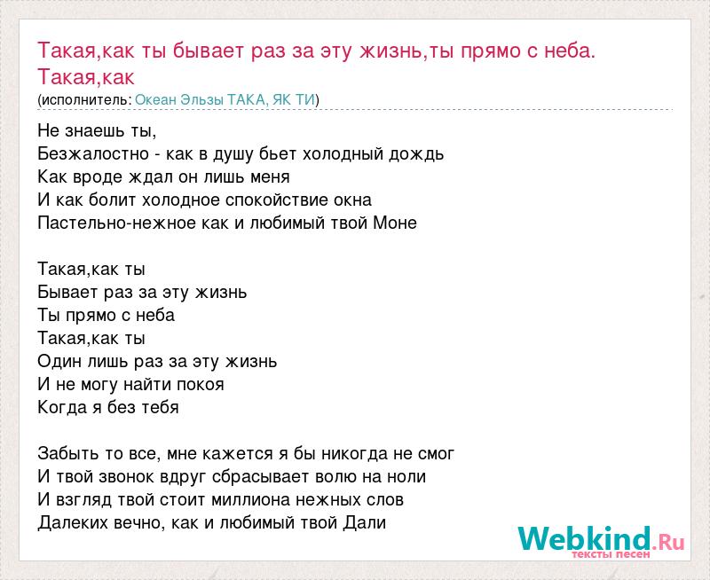 Главная→Исполнители→Океан Эльзы ТАКА, ЯК ТИ→Такая,как ты бывает раз за эту жизнь,ты прямо с неба. Такая,как ты, од