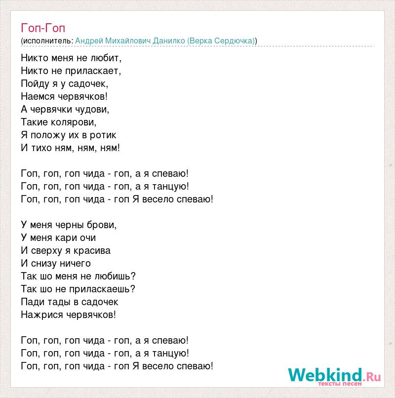 Никто меня не любит, Никто не приласкает, Пойду я у садочек, Наемся червячков! А червячки чудови, Такие колярови, Я положу их в ротик И тихо ням, ням, ням! Гоп, гоп, гоп чида - гоп, а я спеваю! Гоп, гоп, гоп чида - гоп, а я танцую! Гоп, гоп, гоп чида - гоп Я весело спеваю! У меня черны брови, У меня кари очи И сверху я красива И снизу ничего Так шо меня не любишь? Так шо не приласкаешь? Пади тады в садочек Нажрися червячков! Гоп, гоп, гоп чида - гоп, а я спеваю! Гоп, гоп, гоп чида - гоп, а я танцую! Гоп, гоп, гоп чида - гоп Я весело спеваю!