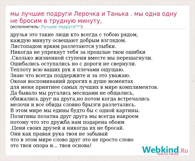 Мы лучшие подруги Лерочка и Танька . мы одна одну не бросим в трудную
