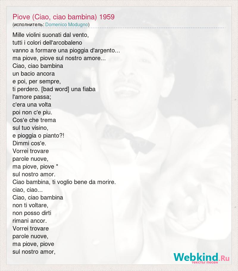 Mille violini suonati dal vento, tutti i colori dell'arcobaleno vanno a formare una pioggia d'argento... ma piove, piove sul nostro amore... Ciao, ciao bambina un bacio ancora e poi, per sempre, ti perdero. [bad word] una fiaba l'amore passa; c'era una volta poi non c'e piu. Cos'e che trema sul tuo visino, e pioggia o pianto?! Dimmi cos'e. Vorrei trovare parole nuove, ma piove, piove * sul nostro amor. Ciao bambina, ti voglio bene da morire. ciao, ciao... Ciao, ciao bambina non ti voltare, non posso dirti rimani ancor. Vorrei trovare parole nuove, ma piove, piove sul nostro amor,