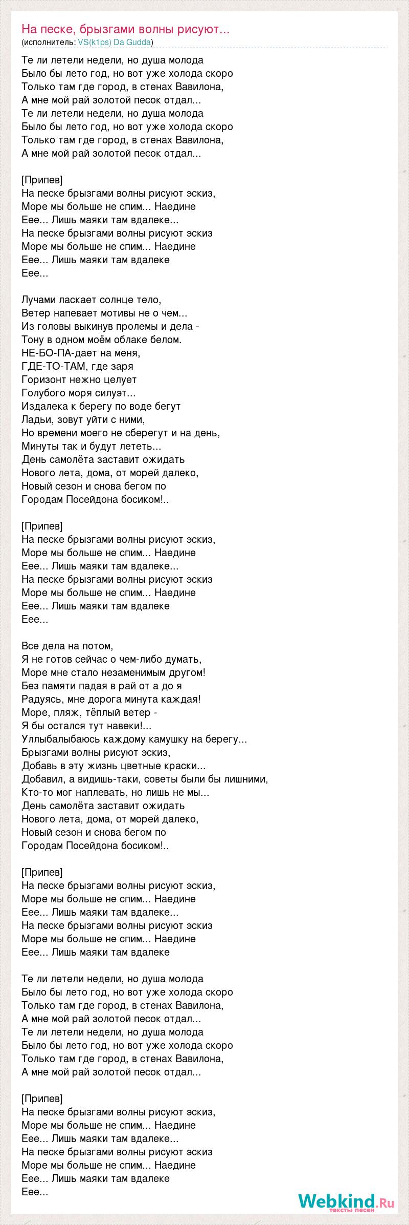 Те ли летели недели, но душа молода Было бы лето год, но вот уже холода скоро Только там где город, в стенах Вавилона, А мне мой рай золотой песок отдал... Те ли летели недели, но душа молода Было бы лето год, но вот уже холода скоро Только там где город, в стенах Вавилона, А мне мой рай золотой песок отдал... [Припев] На песке брызгами волны рисуют эскиз, Море мы больше не спим... Наедине Еее... Лишь маяки там вдалеке... На песке брызгами волны рисуют эскиз Море мы больше не спим... Наедине Еее... Лишь маяки там вдалеке Еее... Лучами ласкает солнце тело, Ветер напевает мотивы не о чем... Из головы выкинув пролемы и дела - Тону в одном моём облаке белом. НЕ-БО-ПА-дает на меня, ГДЕ-ТО-ТАМ, где заря Горизонт нежно целует Голубого моря силуэт... Издалека к берегу по воде бегут Ладьи, зовут уйти с ними, Но времени моего не сберегут и на день, Минуты так и будут лететь... День самолёта заставит ожидать Нового лета, дома, от морей далеко, Новый сезон и снова бегом по Городам Посейдона босиком!.. [Припев] На песке брызгами волны рисуют эскиз, Море мы больше не спим... Наедине Еее... Лишь маяки там вдалеке... На песке брызгами волны рисуют эскиз Море мы больше не спим... Наедине Еее... Лишь маяки там вдалеке Еее... Все дела на потом, Я не готов сейчас о чем-либо думать, Море мне стало незаменимым другом! Без памяти падая в рай от а до я Радуясь, мне дорога минута каждая! Море, пляж, тёплый ветер - Я бы остался тут навеки!... Уллыбалыбаюсь каждому камушку на берегу... Брызгами волны рисуют эскиз, Добавь в эту жизнь цветные краски... Добавил, а видишь-таки, советы были бы лишними, Кто-то мог наплевать, но лишь не мы... День самолёта заставит ожидать Нового лета, дома, от морей далеко, Новый сезон и снова бегом по Городам Посейдона босиком!.. [Припев] На песке брызгами волны рисуют эскиз, Море мы больше не спим... Наедине Еее... Лишь маяки там вдалеке... На песке брызгами волны рисуют эскиз Море мы больше не спим... Наедине Еее... Лишь маяки там вдалеке Те ли летели недели, но душа молода Было бы лето год, но вот уже холода скоро Только там где город, в стенах Вавилона, А мне мой рай золотой песок отдал... Те ли летели недели, но душа молода Было бы лето год, но вот уже холода скоро Только там где город, в стенах Вавилона, А мне мой рай золотой песок отдал... [Припев] На песке брызгами волны рисуют эскиз, Море мы больше не спим... Наедине Еее... Лишь маяки там вдалеке... На песке брызгами волны рисуют эскиз Море мы больше не спим... Наедине Еее... Лишь маяки там вдалеке Еее...