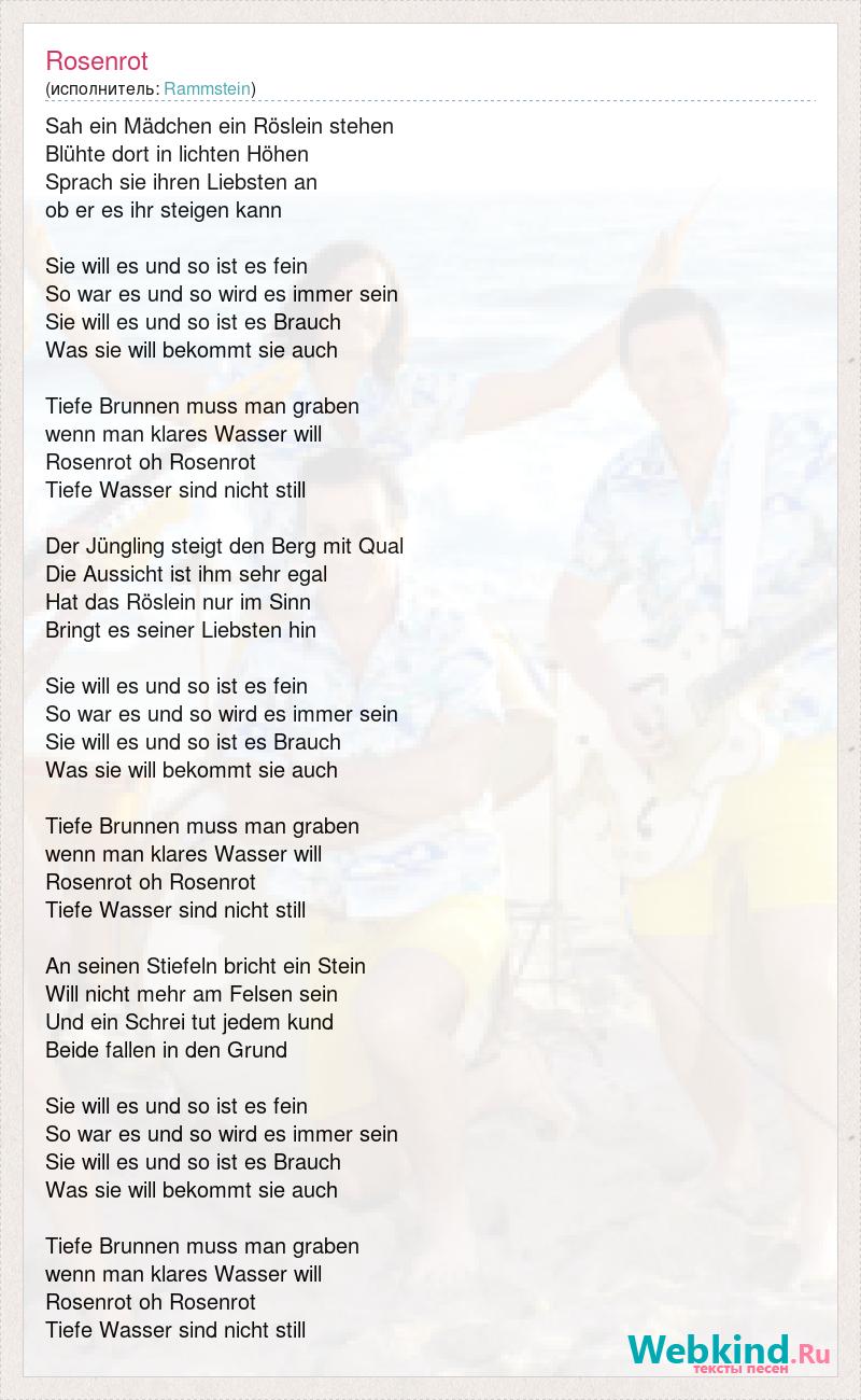 Sah ein Mädchen ein Röslein stehen Blühte dort in lichten Höhen Sprach sie ihren Liebsten an ob er es ihr steigen kann Sie will es und so ist es fein So war es und so wird es immer sein Sie will es und so ist es Brauch Was sie will bekommt sie auch Tiefe Brunnen muss man graben wenn man klares Wasser will Rosenrot oh Rosenrot Tiefe Wasser sind nicht still Der Jüngling steigt den Berg mit Qual Die Aussicht ist ihm sehr egal Hat das Röslein nur im Sinn Bringt es seiner Liebsten hin Sie will es und so ist es fein So war es und so wird es immer sein Sie will es und so ist es Brauch Was sie will bekommt sie auch Tiefe Brunnen muss man graben wenn man klares Wasser will Rosenrot oh Rosenrot Tiefe Wasser sind nicht still An seinen Stiefeln bricht ein Stein Will nicht mehr am Felsen sein Und ein Schrei tut jedem kund Beide fallen in den Grund Sie will es und so ist es fein So war es und so wird es immer sein Sie will es und so ist es Brauch Was sie will bekommt sie auch Tiefe Brunnen muss man graben wenn man klares Wasser will Rosenrot oh Rosenrot Tiefe Wasser sind nicht still