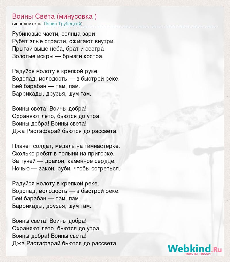Рубиновые части, солнца зари Рубят злые страсти, сжигают внутри. Прыгай выше неба, брат и сестра Золотые искры — брызги костра. Радуйся молоту в крепкой руке, Водопад, молодость — в быстрой реке. Бей барабан — пам, пам. Баррикады, друзья, шум гам. Воины света! Воины добра! Охраняют лето, бьются до утра. Воины добра! Воины света! Джа Растафарай бьются до рассвета. Плачет солдат, медаль на гимнастёрке. Сколько ребят в полыни на пригорке. За тучей — дракон, каменное сердце. Ночью — закон, руби, чтобы согреться. Радуйся молоту в крепкой реке. Водопад, молодость — в быстрой реке. Бей барабан — пам, пам. Баррикады, друзья, шум гам. Воины света! Воины добра! Охраняют лето, бьются до утра. Воины добра! Воины света! Джа Растафарай бьются до рассвета.