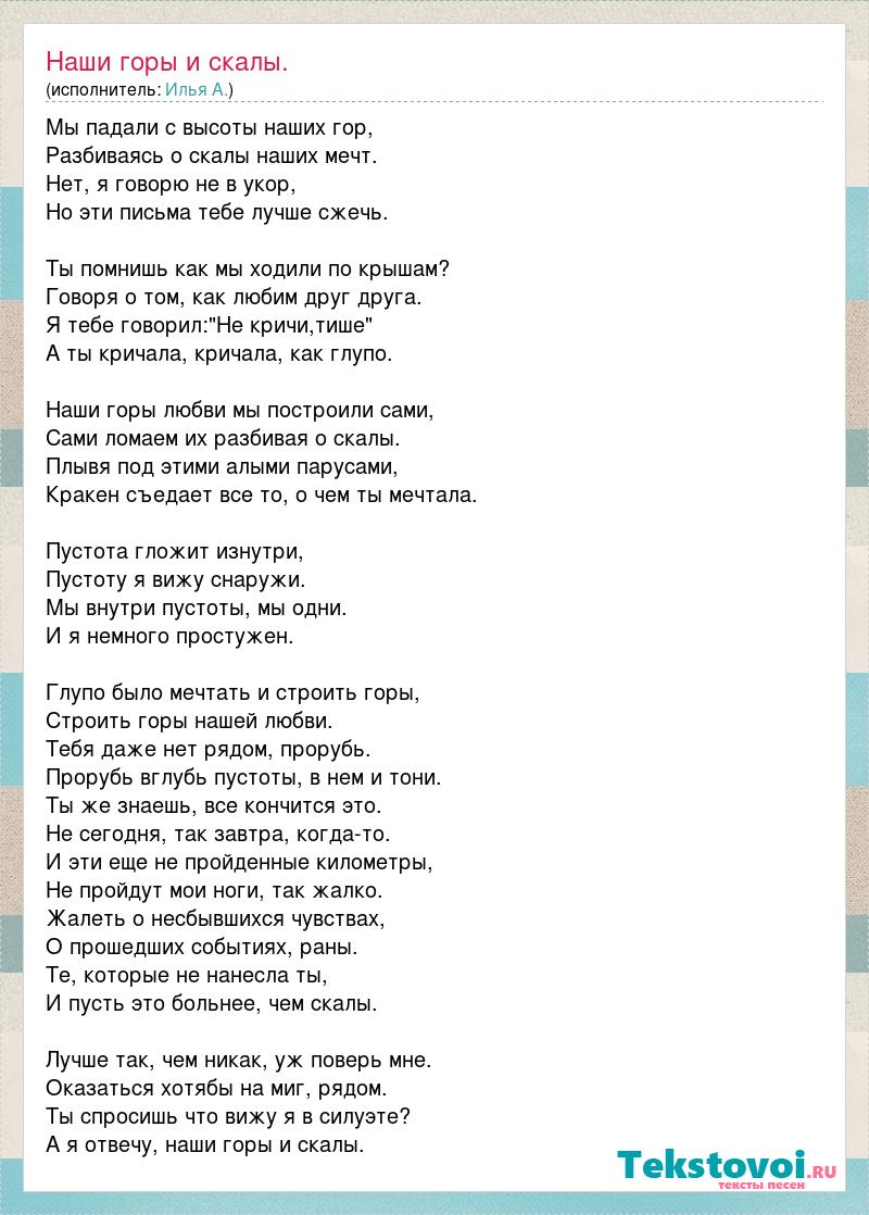 Мы падали с высоты наших гор, Разбиваясь о скалы наших мечт. Нет, я говорю не в укор, Но эти письма тебе лучше сжечь. Ты помнишь как мы ходили по крышам? Говоря о том, как любим друг друга. Я тебе говорил:"Не кричи,тише" А ты кричала, кричала, как глупо. Наши горы любви мы построили сами, Сами ломаем их разбивая о скалы. Плывя под этими алыми парусами, Кракен съедает все то, о чем ты мечтала. Пустота гложит изнутри, Пустоту я вижу снаружи. Мы внутри пустоты, мы одни. И я немного простужен. Глупо было мечтать и строить горы, Строить горы нашей любви. Тебя даже нет рядом, прорубь. Прорубь вглубь пустоты, в нем и тони. Ты же знаешь, все кончится это. Не сегодня, так завтра, когда-то. И эти еще не пройденные километры, Не пройдут мои ноги, так жалко. Жалеть о несбывшихся чувствах, О прошедших событиях, раны. Те, которые не нанесла ты, И пусть это больнее, чем скалы. Лучше так, чем никак, уж поверь мне. Оказаться хотябы на миг, рядом. Ты спросишь что вижу я в силуэте? А я отвечу, наши горы и скалы.