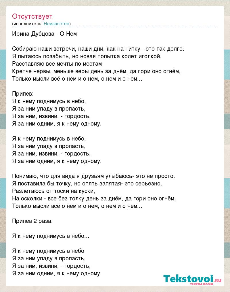 Ирина Дубцова - О Нем Собираю наши встречи, наши дни, как на нитку - это так долго. Я пытаюсь позабыть, но новая попытка колет иголкой. Расставляю все мечты по местам- Крепче нервы, меньше веры день за днём, да гори оно огнём, Только мысли всё о нем и о нем, о нем и о нем... Припев: Я к нему поднимусь в небо, Я за ним упаду в пропасть, Я за ним, извини, - гордость, Я за ним одним, я к нему одному. Я к нему поднимусь в небо, Я за ним упаду в пропасть, Я за ним, извини, - гордость, Я за ним одним, я к нему одному. Понимаю, что для вида я друзьям улыбаюсь- это не просто. Я поставила бы точку, но опять запятая- это серьезно. Разлетаюсь от тоски на куски, На осколки - все без толку день за днём, да гори оно огнём, Только мысли всё о нем и о нем, о нем и о нем... Припев 2 раза. Я к нему поднимусь в небо... Я к нему поднимусь в небо Я за ним упаду в пропасть, Я за ним, извини, - гордость, Я за ним одним, я к нему одному.