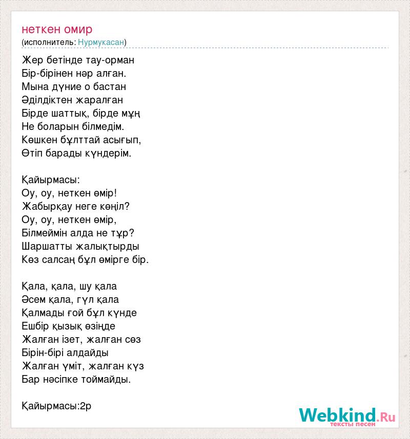 Жер бетінде тау-орман Бір-бірінен нәр алған. Мына дүние о бастан Әділдіктен жаралған Бірде шаттық, бірде мұң Не боларын білмедім. Көшкен бұлттай асығып, Өтіп барады күндерім. Қайырмасы: Оу, оу, неткен өмір! Жабырқау неге көңіл? Оу, оу, неткен өмір, Білмеймін алда не тұр? Шаршатты жалықтырды Көз салсаң бұл өмірге бір. Қала, қала, шу қала Әсем қала, гүл қала Қалмады ғой бұл күнде Ешбір қызық өзіңде Жалған ізет, жалған сөз Бірін-бірі алдайды Жалған үміт, жалған күз Бар нәсіпке тоймайды. Қайырмасы:2р