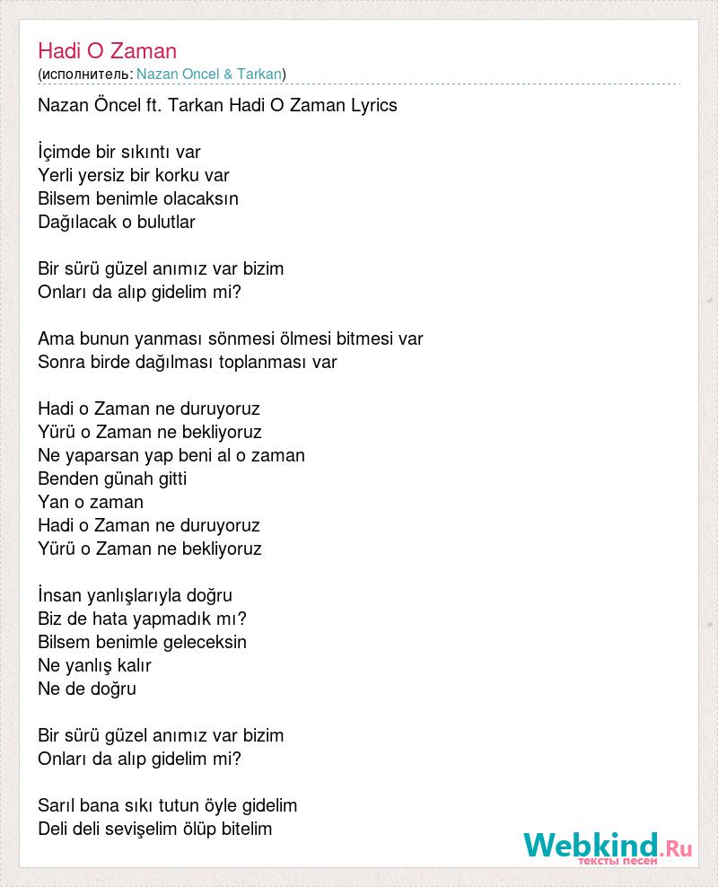 Nazan Öncel ft. Tarkan Hadi O Zaman Lyrics İçimde bir sıkıntı var Yerli yersiz bir korku var Bilsem benimle olacaksın Dağılacak o bulutlar Bir sürü güzel anımız var bizim Onları da alıp gidelim mi? Ama bunun yanması sönmesi ölmesi bitmesi var Sonra birde dağılması toplanması var Hadi o Zaman ne duruyoruz Yürü o Zaman ne bekliyoruz Ne yaparsan yap beni al o zaman Benden günah gitti Yan o zaman Hadi o Zaman ne duruyoruz Yürü o Zaman ne bekliyoruz İnsan yanlışlarıyla doğru Biz de hata yapmadık mı? Bilsem benimle geleceksin Ne yanlış kalır Ne de doğru Bir sürü güzel anımız var bizim Onları da alıp gidelim mi? Sarıl bana sıkı tutun öyle gidelim Deli deli sevişelim ölüp bitelim