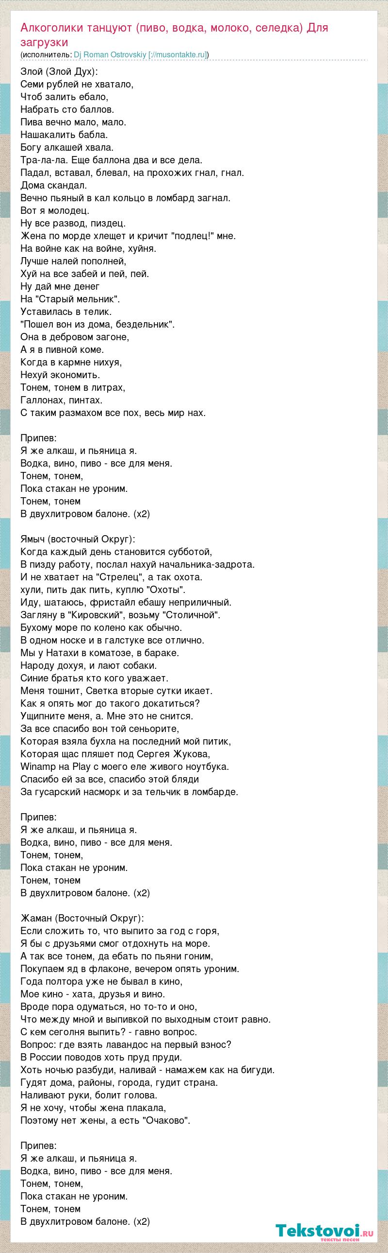 Злой (Злой Дух): Семи рублей не хватало, Чтоб залить ебало, Набрать сто баллов. Пива вечно мало, мало. Нашакалить бабла. Богу алкашей хвала. Тра-ла-ла. Еще баллона два и все дела. Падал, вставал, блевал, на прохожих гнал, гнал. Дома скандал. Вечно пьяный в кал кольцо в ломбард загнал. Вот я молодец. Ну все развод, пиздец. Жена по морде хлещет и кричит "подлец!" мне. На войне как на войне, хуйня. Лучше налей пополней, Хуй на все забей и пей, пей. Ну дай мне денег На "Старый мельник". Уставилась в телик. "Пошел вон из дома, бездельник". Она в дебровом загоне, А я в пивной коме. Когда в кармне нихуя, Нехуй экономить. Тонем, тонем в литрах, Галлонах, пинтах. С таким размахом все пох, весь мир нах. Припев: Я же алкаш, и пьяница я. Водка, вино, пиво - все для меня. Тонем, тонем, Пока стакан не уроним. Тонем, тонем В двухлитровом балоне. (x2) Ямыч (восточный Округ): Когда каждый день становится субботой, В пизду работу, послал нахуй начальника-задрота. И не хватает на "Стрелец", а так охота. хули, пить дак пить, куплю "Охоты". Иду, шатаюсь, фристайл ебашу неприличный. Загляну в "Кировский", возьму "Столичной". Бухому море по колено как обычно. В одном носке и в галстуке все отлично. Мы у Натахи в коматозе, в бараке. Народу дохуя, и лают собаки. Синие братья кто кого уважает. Меня тошнит, Светка вторые сутки икает. Как я опять мог до такого докатиться? Ущипните меня, а. Мне это не снится. За все спасибо вон той сеньорите, Которая взяла бухла на последний мой питик, Которая щас пляшет под Сергея Жукова, Winamp на Play с моего еле живого ноутбука. Спасибо ей за все, спасибо этой бляди За гусарский насморк и за тельчик в ломбарде. Припев: Я же алкаш, и пьяница я. Водка, вино, пиво - все для меня. Тонем, тонем, Пока стакан не уроним. Тонем, тонем В двухлитровом балоне. (x2) Жаман (Восточный Округ): Если сложить то, что выпито за год с горя, Я бы с друзьями смог отдохнуть на море. А так все тонем, да ебать по пьяни гоним, Покупаем яд в флаконе, вечером опять уроним. Года полтора уже не бывал в кино, Мое кино - хата, друзья и вино. Вроде пора одуматься, но то-то и оно, Что между мной и выпивкой по выходным стоит равно. С кем сеголня выпить? - гавно вопрос. Вопрос: где взять лавандос на первый взнос? В России поводов хоть пруд пруди. Хоть ночью разбуди, наливай - намажем как на бигуди. Гудят дома, районы, города, гудит страна. Наливают руки, болит голова. Я не хочу, чтобы жена плакала, Поэтому нет жены, а есть "Очаково". Припев: Я же алкаш, и пьяница я. Водка, вино, пиво - все для меня. Тонем, тонем, Пока стакан не уроним. Тонем, тонем В двухлитровом балоне. (x2)
