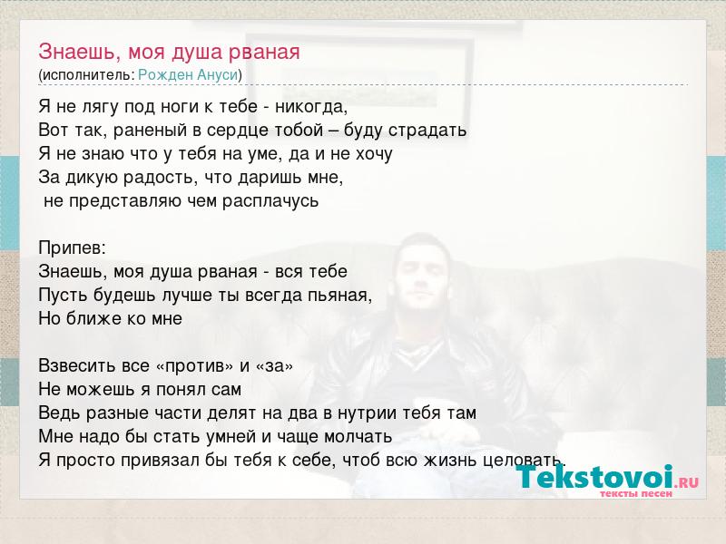 Я не лягу под ноги к тебе - никогда, Вот так, раненый в сердце тобой – буду страдать Я не знаю что у тебя на уме, да и не хочу За дикую радость, что даришь мне, не представляю чем расплачусь Припев: Знаешь, моя душа рваная - вся тебе Пусть будешь лучше ты всегда пьяная, Но ближе ко мне Взвесить все «против» и «за» Не можешь я понял сам Ведь разные части делят на два в нутрии тебя там Мне надо бы стать умней и чаще молчать Я просто привязал бы тебя к себе, чтоб всю жизнь целовать.