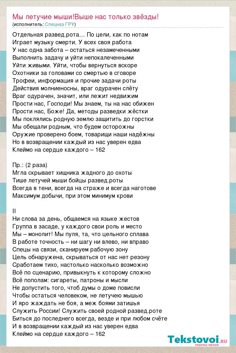 Отдельная развед.рота… По цели, как по нотам Играет музыку смерти. У всех своя работа У нас одна забота – остаться незамеченными Выполнить задачу и уйти непокалеченными Уйти живыми. Уйти, чтобы вернуться вскоре Охотники за головами со смертью в сговоре Трофеи, информация и прочие задачи роты Действия молниеносны, враг одурачен слёту Враг одурачен, значит, или лежит недвижим Прости нас, Господи! Мы знаем, ты на нас обижен Прости нас, Боже! Да, методы разведки жёстки Мы поклялись родную землю защитить до горстки Мы обещали родным, что будем осторожны Оружие проверено боем, товарищи наши надёжны Но в возвращении каждый из нас уверен едва Клеймо на сердце каждого – 162 Пр.: (2 раза) Мгла скрывает хищника жадного до охоты Тише летучей мыши бойцы развед.роты Всегда в тени, всегда на страже и всегда наготове Максимум добычи, при этом минимум крови II Ни слова за день, общаемся на языке жестов Группа в засаде, у каждого свои роль и место Мы – монолит! Мы пуля, та, что цельного сплава В работе точность – ни шагу ни влево, ни вправо Спецы на связи, сканируем рабочую зону Цель обнаружена, скрываться от нас нет резону Сработаем тихо, настолько насколько возможно Всё по сценарию, привыкнуть к которому сложно Всё пополам: сигареты, патроны и мысли Не допустить того, чтоб думы о доме повисли Чтобы остаться человеком, не летучею мышью И яро жаждать не боя, а меж боями затишья Служить России! Служить своей родной развед.роте Биться до последнего всегда, везде и при любом счёте И в возвращении каждый из нас уверен едва Клеймо на сердце каждого – 162