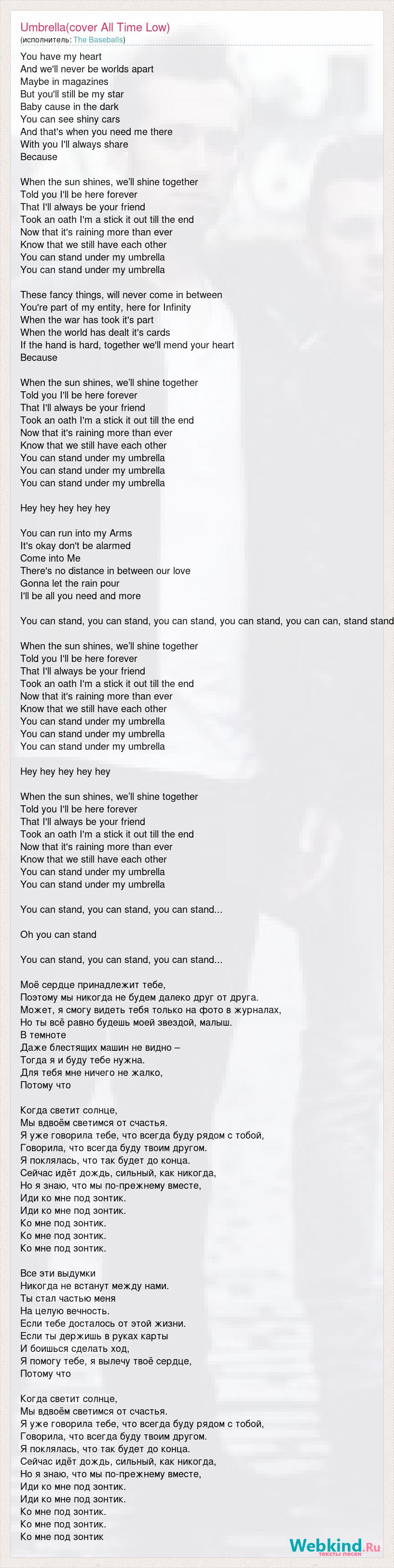 You have my heart And we'll never be worlds apart Maybe in magazines But you'll still be my star Baby cause in the dark You can see shiny cars And that's when you need me there With you I'll always share Because When the sun shines, we’ll shine together Told you I'll be here forever That I'll always be your friend Took an oath I'm a stick it out till the end Now that it's raining more than ever Know that we still have each other You can stand under my umbrella You can stand under my umbrella These fancy things, will never come in between You're part of my entity, here for Infinity When the war has took it's part When the world has dealt it's cards If the hand is hard, together we'll mend your heart Because When the sun shines, we’ll shine together Told you I'll be here forever That I'll always be your friend Took an oath I'm a stick it out till the end Now that it's raining more than ever Know that we still have each other You can stand under my umbrella You can stand under my umbrella You can stand under my umbrella Hey hey hey hey hey You can run into my Arms It's okay don't be alarmed Come into Me There's no distance in between our love Gonna let the rain pour I'll be all you need and more You can stand, you can stand, you can stand, you can stand, you can can, stand stand When the sun shines, we’ll shine together Told you I'll be here forever That I'll always be your friend Took an oath I'm a stick it out till the end Now that it's raining more than ever Know that we still have each other You can stand under my umbrella You can stand under my umbrella You can stand under my umbrella Hey hey hey hey hey When the sun shines, we’ll shine together Told you I'll be here forever That I'll always be your friend Took an oath I'm a stick it out till the end Now that it's raining more than ever Know that we still have each other You can stand under my umbrella You can stand under my umbrella You can stand, you can stand, you can stand... Oh you can stand You can stand, you can stand, you can stand... Моё сердце принадлежит тебе, Поэтому мы никогда не будем далеко друг от друга. Может, я смогу видеть тебя только на фото в журналах, Но ты всё равно будешь моей звездой, малыш. В темноте Даже блестящих машин не видно – Тогда я и буду тебе нужна. Для тебя мне ничего не жалко, Потому что Когда светит солнце, Мы вдвоём светимся от счастья. Я уже говорила тебе, что всегда буду рядом с тобой, Говорила, что всегда буду твоим другом. Я поклялась, что так будет до конца. Сейчас идёт дождь, сильный, как никогда, Но я знаю, что мы по-прежнему вместе, Иди ко мне под зонтик. Иди ко мне под зонтик. Ко мне под зонтик. Ко мне под зонтик. Ко мне под зонтик. Все эти выдумки Никогда не встанут между нами. Ты стал частью меня На целую вечность. Если тебе досталось от этой жизни. Если ты держишь в руках карты И боишься сделать ход, Я помогу тебе, я вылечу твоё сердце, Потому что Когда светит солнце, Мы вдвоём светимся от счастья. Я уже говорила тебе, что всегда буду рядом с тобой, Говорила, что всегда буду твоим другом. Я поклялась, что так будет до конца. Сейчас идёт дождь, сильный, как никогда, Но я знаю, что мы по-прежнему вместе, Иди ко мне под зонтик. Иди ко мне под зонтик. Ко мне под зонтик. Ко мне под зонтик. Ко мне под зонтик