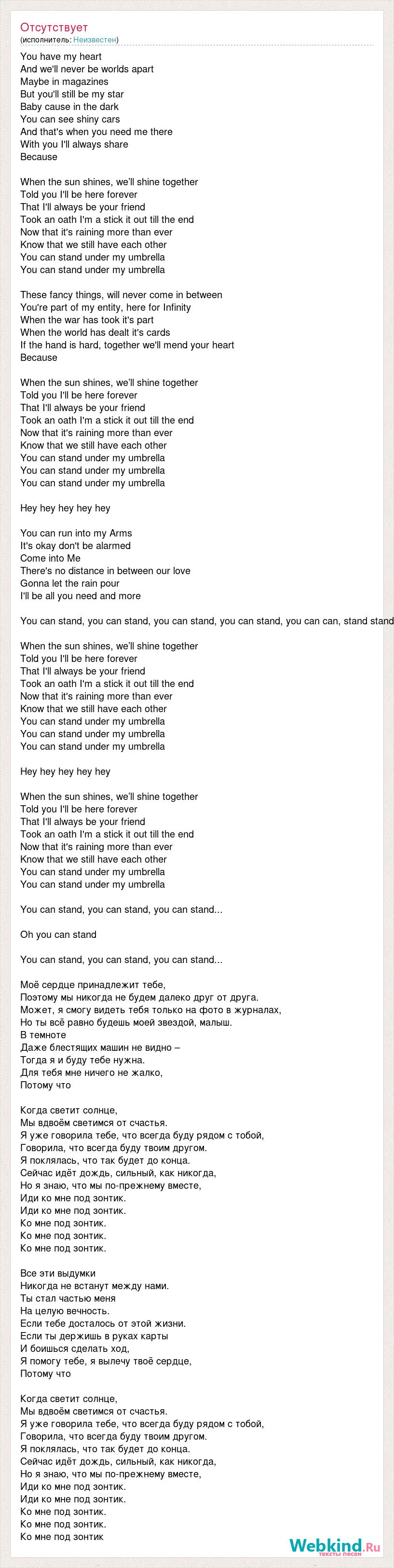 You have my heart And we'll never be worlds apart Maybe in magazines But you'll still be my star Baby cause in the dark You can see shiny cars And that's when you need me there With you I'll always share Because When the sun shines, we’ll shine together Told you I'll be here forever That I'll always be your friend Took an oath I'm a stick it out till the end Now that it's raining more than ever Know that we still have each other You can stand under my umbrella You can stand under my umbrella These fancy things, will never come in between You're part of my entity, here for Infinity When the war has took it's part When the world has dealt it's cards If the hand is hard, together we'll mend your heart Because When the sun shines, we’ll shine together Told you I'll be here forever That I'll always be your friend Took an oath I'm a stick it out till the end Now that it's raining more than ever Know that we still have each other You can stand under my umbrella You can stand under my umbrella You can stand under my umbrella Hey hey hey hey hey You can run into my Arms It's okay don't be alarmed Come into Me There's no distance in between our love Gonna let the rain pour I'll be all you need and more You can stand, you can stand, you can stand, you can stand, you can can, stand stand When the sun shines, we’ll shine together Told you I'll be here forever That I'll always be your friend Took an oath I'm a stick it out till the end Now that it's raining more than ever Know that we still have each other You can stand under my umbrella You can stand under my umbrella You can stand under my umbrella Hey hey hey hey hey When the sun shines, we’ll shine together Told you I'll be here forever That I'll always be your friend Took an oath I'm a stick it out till the end Now that it's raining more than ever Know that we still have each other You can stand under my umbrella You can stand under my umbrella You can stand, you can stand, you can stand... Oh you can stand You can stand, you can stand, you can stand... Моё сердце принадлежит тебе, Поэтому мы никогда не будем далеко друг от друга. Может, я смогу видеть тебя только на фото в журналах, Но ты всё равно будешь моей звездой, малыш. В темноте Даже блестящих машин не видно – Тогда я и буду тебе нужна. Для тебя мне ничего не жалко, Потому что Когда светит солнце, Мы вдвоём светимся от счастья. Я уже говорила тебе, что всегда буду рядом с тобой, Говорила, что всегда буду твоим другом. Я поклялась, что так будет до конца. Сейчас идёт дождь, сильный, как никогда, Но я знаю, что мы по-прежнему вместе, Иди ко мне под зонтик. Иди ко мне под зонтик. Ко мне под зонтик. Ко мне под зонтик. Ко мне под зонтик. Все эти выдумки Никогда не встанут между нами. Ты стал частью меня На целую вечность. Если тебе досталось от этой жизни. Если ты держишь в руках карты И боишься сделать ход, Я помогу тебе, я вылечу твоё сердце, Потому что Когда светит солнце, Мы вдвоём светимся от счастья. Я уже говорила тебе, что всегда буду рядом с тобой, Говорила, что всегда буду твоим другом. Я поклялась, что так будет до конца. Сейчас идёт дождь, сильный, как никогда, Но я знаю, что мы по-прежнему вместе, Иди ко мне под зонтик. Иди ко мне под зонтик. Ко мне под зонтик. Ко мне под зонтик. Ко мне под зонтик