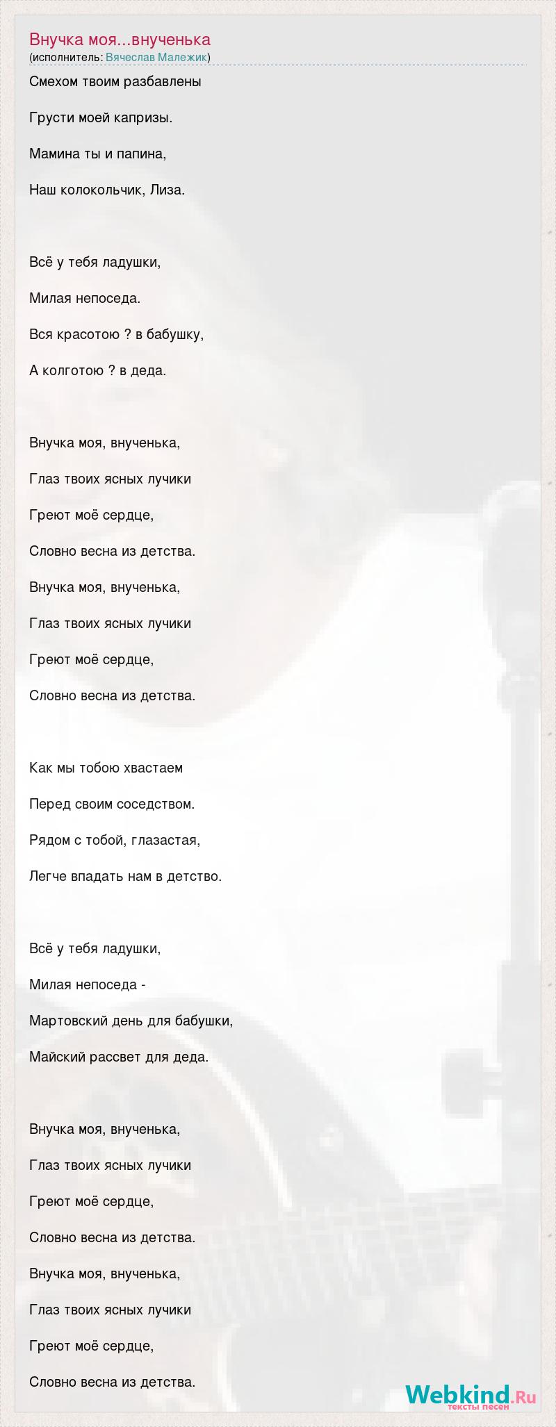 Смехом твоим разбавлены Грусти моей капризы. Мамина ты и папина, Наш колокольчик, Лиза. Всё у тебя ладушки, Милая непоседа. Вся красотою ? в бабушку, А колготою ? в деда. Внучка моя, внученька, Глаз твоих ясных лучики Греют моё сердце, Словно весна из детства. Внучка моя, внученька, Глаз твоих ясных лучики Греют моё сердце, Словно весна из детства. Как мы тобою хвастаем Перед своим соседством. Рядом с тобой, глазастая, Легче впадать нам в детство. Всё у тебя ладушки, Милая непоседа - Мартовский день для бабушки, Майский рассвет для деда. Внучка моя, внученька, Глаз твоих ясных лучики Греют моё сердце, Словно весна из детства. Внучка моя, внученька, Глаз твоих ясных лучики Греют моё сердце, Словно весна из детства.