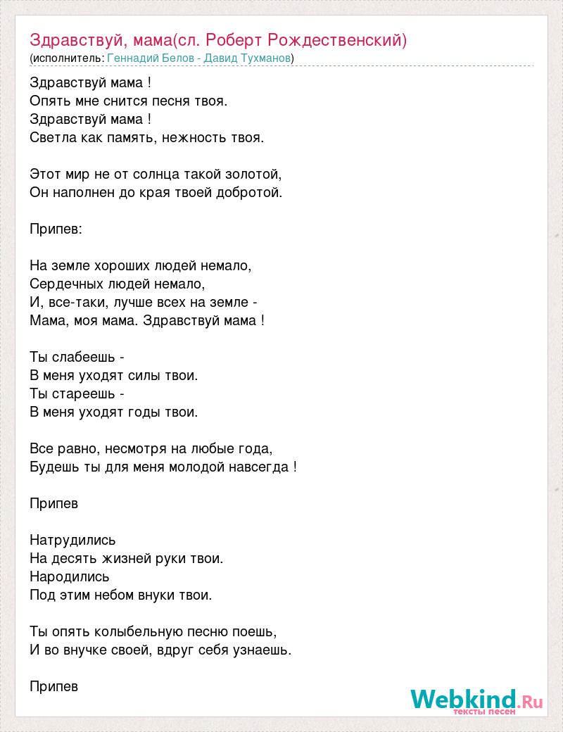 Здравствуй мама ! Опять мне снится песня твоя. Здравствуй мама ! Светла как память, нежность твоя. Этот мир не от солнца такой золотой, Он наполнен до края твоей добротой. Припев: На земле хороших людей немало, Сердечных людей немало, И, все-таки, лучше всех на земле - Мама, моя мама. Здравствуй мама ! Ты слабеешь - В меня уходят силы твои. Ты стареешь - В меня уходят годы твои. Все равно, несмотря на любые года, Будешь ты для меня молодой навсегда ! Припев Натрудились На десять жизней руки твои. Народились Под этим небом внуки твои. Ты опять колыбельную песню поешь, И во внучке своей, вдруг себя узнаешь. Припев