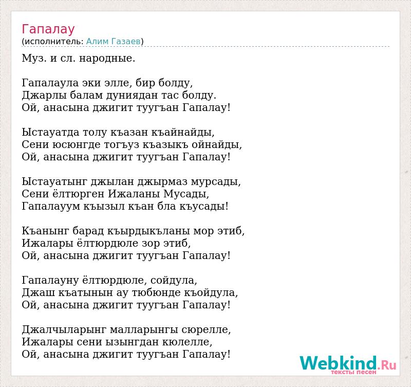 Муз. и сл. народные. Гапалаула эки элле, бир болду, Джарлы балам дуниядан тас болду. Ой, анасына джигит туугъан Гапалау! Ыстауатда толу къазан къайнайды, Сени юсюнгде тогъуз къазыкъ ойнайды, Ой, анасына джигит туугъан Гапалау! Ыстауатынг джылан джырмаз мурсады, Сени ёлтюрген Ижаланы Мусады, Гапалауум къызыл къан бла къусады! Къанынг барад къырдыкъланы мор этиб, Ижалары ёлтюрдюле зор этиб, Ой, анасына джигит туугъан Гапалау! Гапалауну ёлтюрдюле, сойдула, Джаш къатынын ау тюбюнде къойдула, Ой, анасына джигит туугъан Гапалау! Джалчыларынг малларынгы сюрелле, Ижалары сени ызынгдан кюлелле, Ой, анасына джигит туугъан Гапалау!