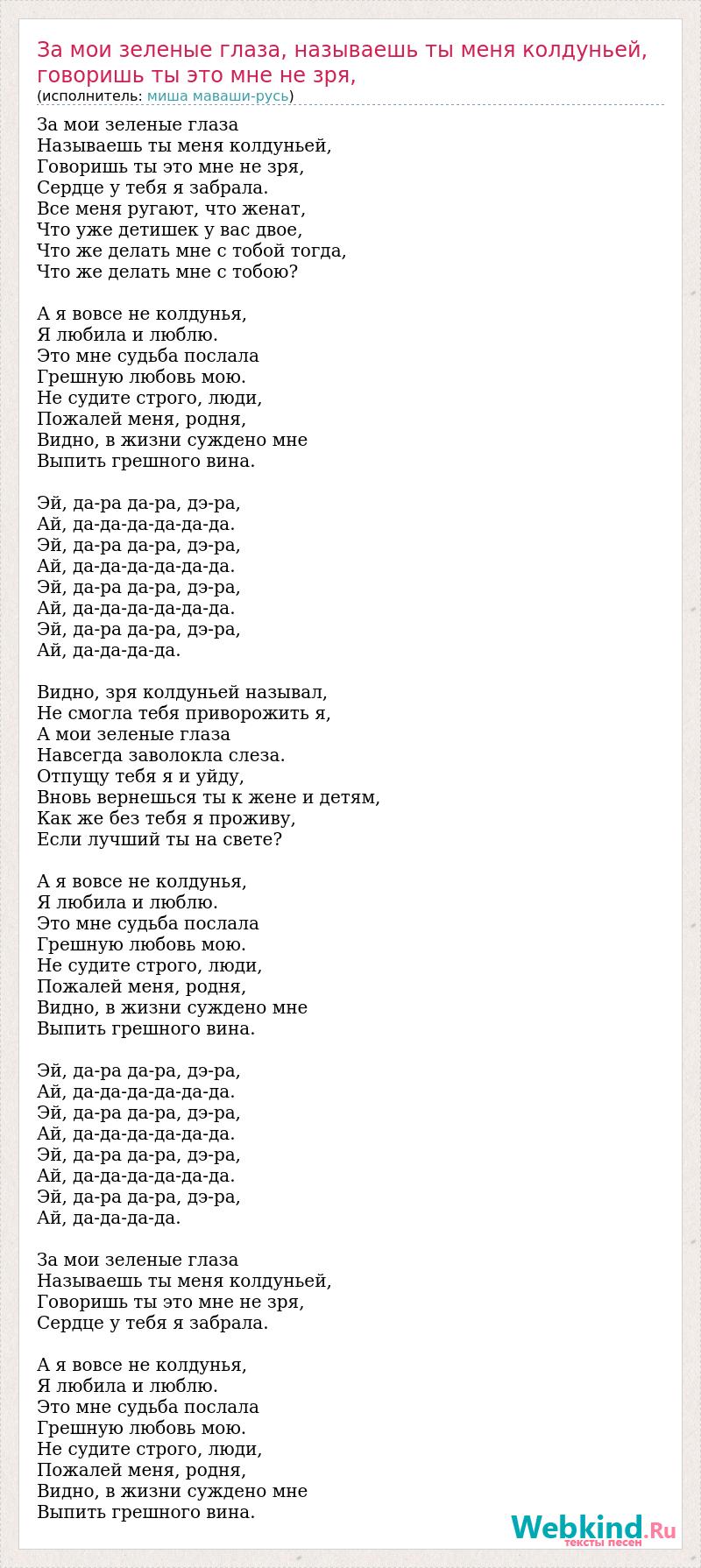 За мои зеленые глаза Называешь ты меня колдуньей, Говоришь ты это мне не зря, Сердце у тебя я забрала. Все меня ругают, что женат, Что уже детишек у вас двое, Что же делать мне с тобой тогда, Что же делать мне с тобою? А я вовсе не колдунья, Я любила и люблю. Это мне судьба послала Грешную любовь мою. Не судите строго, люди, Пожалей меня, родня, Видно, в жизни суждено мне Выпить грешного вина. Эй, да-ра да-ра, дэ-ра, Ай, да-да-да-да-да-да. Эй, да-ра да-ра, дэ-ра, Ай, да-да-да-да-да-да. Эй, да-ра да-ра, дэ-ра, Ай, да-да-да-да-да-да. Эй, да-ра да-ра, дэ-ра, Ай, да-да-да-да. Видно, зря колдуньей называл, Не смогла тебя приворожить я, А мои зеленые глаза Навсегда заволокла слеза. Отпущу тебя я и уйду, Вновь вернешься ты к жене и детям, Как же без тебя я проживу, Если лучший ты на свете? А я вовсе не колдунья, Я любила и люблю. Это мне судьба послала Грешную любовь мою. Не судите строго, люди, Пожалей меня, родня, Видно, в жизни суждено мне Выпить грешного вина. Эй, да-ра да-ра, дэ-ра, Ай, да-да-да-да-да-да. Эй, да-ра да-ра, дэ-ра, Ай, да-да-да-да-да-да. Эй, да-ра да-ра, дэ-ра, Ай, да-да-да-да-да-да. Эй, да-ра да-ра, дэ-ра, Ай, да-да-да-да. За мои зеленые глаза Называешь ты меня колдуньей, Говоришь ты это мне не зря, Сердце у тебя я забрала. А я вовсе не колдунья, Я любила и люблю. Это мне судьба послала Грешную любовь мою. Не судите строго, люди, Пожалей меня, родня, Видно, в жизни суждено мне Выпить грешного вина.