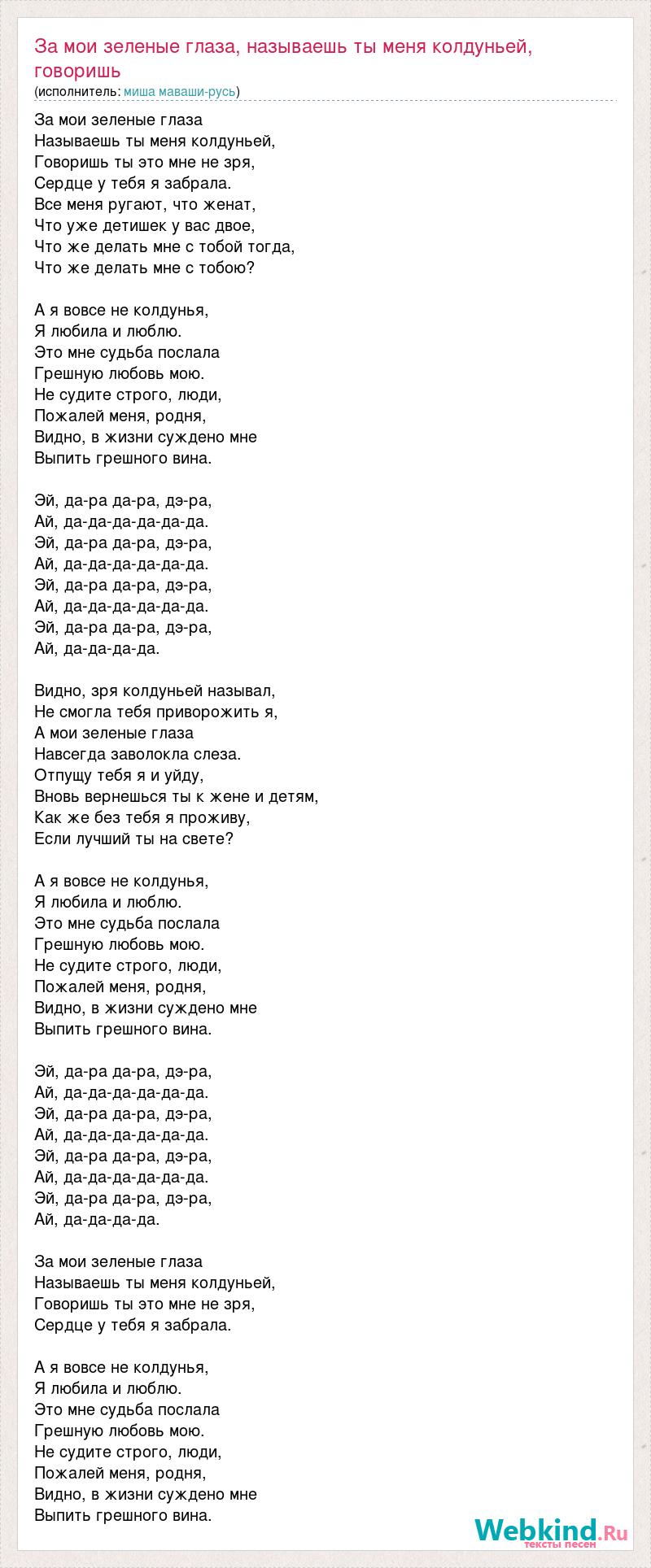 За мои зеленые глаза Называешь ты меня колдуньей, Говоришь ты это мне не зря, Сердце у тебя я забрала. Все меня ругают, что женат, Что уже детишек у вас двое, Что же делать мне с тобой тогда, Что же делать мне с тобою? А я вовсе не колдунья, Я любила и люблю. Это мне судьба послала Грешную любовь мою. Не судите строго, люди, Пожалей меня, родня, Видно, в жизни суждено мне Выпить грешного вина. Эй, да-ра да-ра, дэ-ра, Ай, да-да-да-да-да-да. Эй, да-ра да-ра, дэ-ра, Ай, да-да-да-да-да-да. Эй, да-ра да-ра, дэ-ра, Ай, да-да-да-да-да-да. Эй, да-ра да-ра, дэ-ра, Ай, да-да-да-да. Видно, зря колдуньей называл, Не смогла тебя приворожить я, А мои зеленые глаза Навсегда заволокла слеза. Отпущу тебя я и уйду, Вновь вернешься ты к жене и детям, Как же без тебя я проживу, Если лучший ты на свете? А я вовсе не колдунья, Я любила и люблю. Это мне судьба послала Грешную любовь мою. Не судите строго, люди, Пожалей меня, родня, Видно, в жизни суждено мне Выпить грешного вина. Эй, да-ра да-ра, дэ-ра, Ай, да-да-да-да-да-да. Эй, да-ра да-ра, дэ-ра, Ай, да-да-да-да-да-да. Эй, да-ра да-ра, дэ-ра, Ай, да-да-да-да-да-да. Эй, да-ра да-ра, дэ-ра, Ай, да-да-да-да. За мои зеленые глаза Называешь ты меня колдуньей, Говоришь ты это мне не зря, Сердце у тебя я забрала. А я вовсе не колдунья, Я любила и люблю. Это мне судьба послала Грешную любовь мою. Не судите строго, люди, Пожалей меня, родня, Видно, в жизни суждено мне Выпить грешного вина.