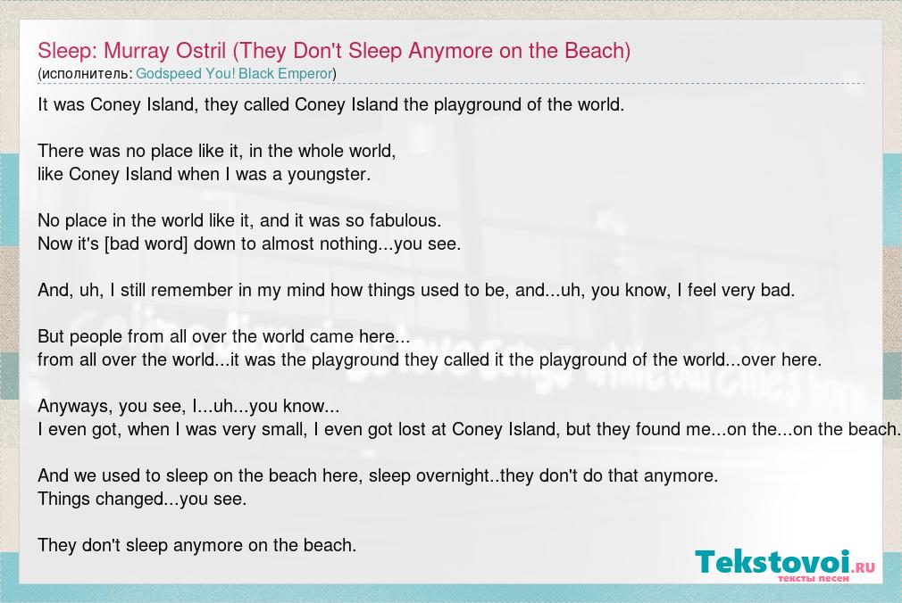 Главная→Исполнители→Godspeed You! Black Emperor→Sleep: Murray Ostril (They Don't Sleep Anymore on the Beach)