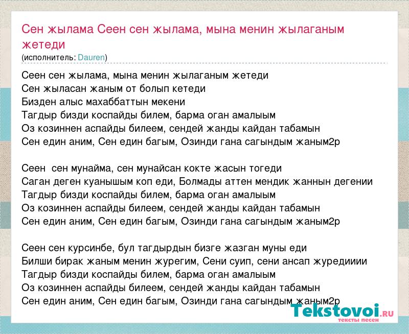Сеен сен жылама, мына менин жылаганым жетеди Сен жыласан жаным от болып кетеди Бизден алыс махаббаттын мекени Тагдыр бизди коспайды билем, барма оган амалыым Оз козиннен аспайды билеем, сендей жанды кайдан табамын Сен един аним, Сен един багым, Озинди гана сагындым жаным2р Сеен сен мунайма, сен мунайсан кокте жасын тогеди Саган деген куанышым коп еди, Болмады аттен мендик жаннын дегении Тагдыр бизди коспайды билем, барма оган амалыым Оз козиннен аспайды билеем, сендей жанды кайдан табамын Сен един аним, Сен един багым, Озинди гана сагындым жаным2р Сеен сен курсинбе, бул тагдырдын бизге жазган муны еди Билши бирак жаным менин журегим, Сени суип, сени ансап журедииии Тагдыр бизди коспайды билем, барма оган амалыым Оз козиннен аспайды билеем, сендей жанды кайдан табамын Сен един аним, Сен един багым, Озинди гана сагындым жаным2р