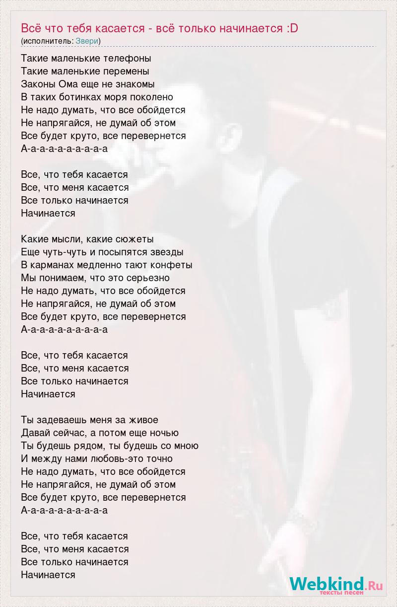 Такие маленькие телефоны Такие маленькие перемены Законы Ома еще не знакомы В таких ботинках моря поколено Не надо думать, что все обойдется Не напрягайся, не думай об этом Все будет круто, все перевернется А-а-а-а-а-а-а-а-а-а Все, что тебя касается Все, что меня касается Все только начинается Начинается Какие мысли, какие сюжеты Еще чуть-чуть и посыпятся звезды В карманах медленно тают конфеты Мы понимаем, что это серьезно Не надо думать, что все обойдется Не напрягайся, не думай об этом Все будет круто, все перевернется А-а-а-а-а-а-а-а-а-а Все, что тебя касается Все, что меня касается Все только начинается Начинается Ты задеваешь меня за живое Давай сейчас, а потом еще ночью Ты будешь рядом, ты будешь со мною И между нами любовь-это точно Не надо думать, что все обойдется Не напрягайся, не думай об этом Все будет круто, все перевернется А-а-а-а-а-а-а-а-а-а Все, что тебя касается Все, что меня касается Все только начинается Начинается