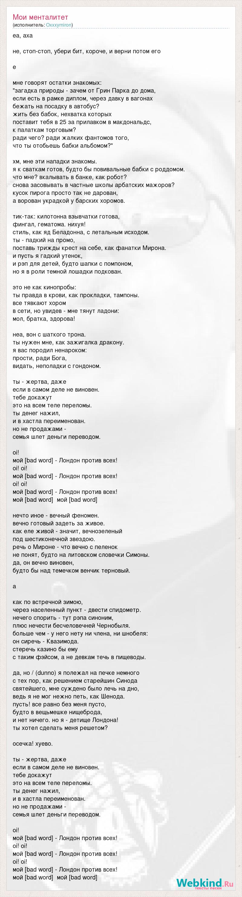 еа, аха не, стоп-стоп, убери бит, короче, и верни потом его е мне говорят остатки знакомых: "загадка природы - зачем от Грин Парка до дома, если есть в рамке диплом, через давку в вагонах бежать на посадку в автобус? жить без бабок, нехватка которых поставит тебя в 25 за прилавком в макдональдс, к палаткам торговым? ради чего? ради жалких фантомов того, что ты отобьешь бабки альбомом?" хм, мне эти нападки знакомы. я к сваткам готов, будто бы повивальные бабки с роддомом. что мне? вкалывать в банке, как робот? снова засовывать в частные школы арбатских мажоров? кусок пирога просто так не дарован, а ворован украдкой у барских хоромов. тик-так: килотонна взывчатки готова, фингал, гематома. нихуя! стиль, как яд Беладонна, с летальным исходом. ты - падкий на промо, поставь трижды крест на себе, как фанатки Мирона. и пусть я гадкий утенок, и рэп для детей, будто шапки с помпоном, но я в роли темной лошадки подкован. это не как кинопробы: ты правда в крови, как прокладки, тампоны. все тявкают хором в сети, но увидев - мне тянут ладони: мол, братка, здорова! неа, вон с шаткого трона. ты нужен мне, как зажигалка дракону. я вас породил ненароком: прости, ради Бога, видать, неполадки с гондоном. ты - жертва, даже если в самом деле не виновен. тебе докажут это на всем теле переломы. ты денег нажил, и в хастла переименован. но не продажами - семья шлет деньги переводом. oi! мой [bad word] - Лондон против всех! oi! oi! мой [bad word] - Лондон против всех! oi! oi! мой [bad word] - Лондон против всех! мой [bad word] мой [bad word] нечто иное - вечный феномен. вечно готовый задеть за живое. как еле живой - значит, вечнозеленый под шестиконечной звездою. речь о Мироне - что вечно с пеленок не понят, будто на литовском словечки Симоны. да, он вечно виновен, будто бы над темечком венчик терновый. а как по встречной зимою, через населенный пункт - двести спидометр. нечего спорить - тут рэпа синоним, плюс нечести бесчеловечней Чернобыля. больше чем - у него нету ни члена, ни шнобеля: он сиречь - Квазимода. стеречь казино бы ему с таким фэйсом, а не девкам течь в пищеводы. да, но / (dunno) я полежал на печке немного с тех пор, как решением старейшин Синода святейшего, мне суждено было лечь на дно, ведь я не мог нежно петь, как Шенода. пусть! все равно без меня пусто, будто в вещьмешке нищеброда, и нет ничего. но я - детище Лондона! ты хотел сделать меня решетом? осечка! хуево. ты - жертва, даже если в самом деле не виновен. тебе докажут это на всем теле переломы. ты денег нажил, и в хастла переименован. но не продажами - семья шлет деньги переводом. oi! мой [bad word] - Лондон против всех! oi! oi! мой [bad word] - Лондон против всех! oi! oi! мой [bad word] - Лондон против всех! мой [bad word] мой [bad word]