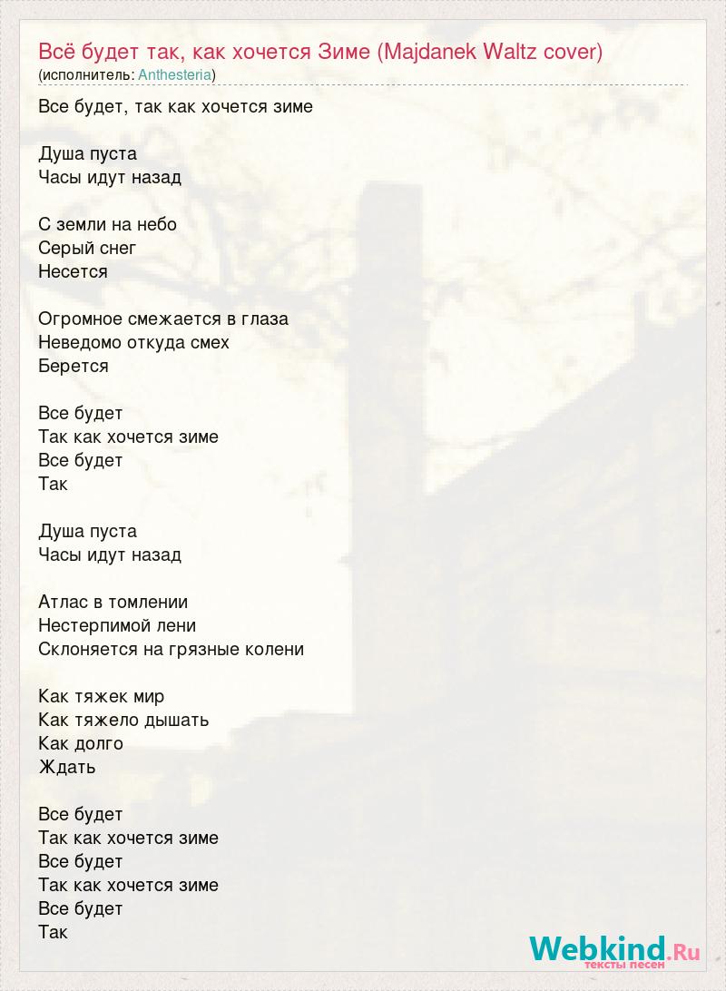 Все будет, так как хочется зиме Душа пуста Часы идут назад С земли на небо Серый снег Несется Огромное смежается в глаза Неведомо откуда смех Берется Все будет Так как хочется зиме Все будет Так Душа пуста Часы идут назад Атлас в томлении Нестерпимой лени Склоняется на грязные колени Как тяжек мир Как тяжело дышать Как долго Ждать Все будет Так как хочется зиме Все будет Так как хочется зиме Все будет Так