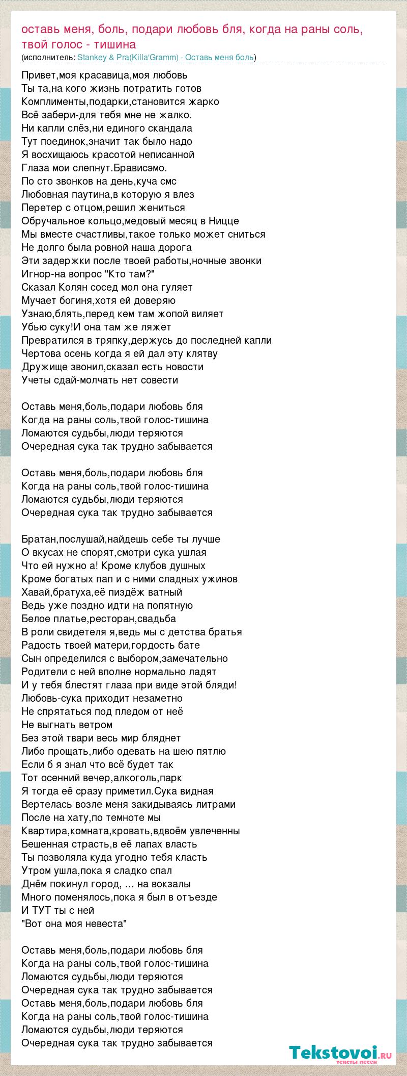 Привет,моя красавица,моя любовь Ты та,на кого жизнь потратить готов Комплименты,подарки,становится жарко Всё забери-для тебя мне не жалко. Ни капли слёз,ни единого скандала Тут поединок,значит так было надо Я восхищаюсь красотой неписанной Глаза мои слепнут.Брависэмо. По сто звонков на день,куча смс Любовная паутина,в которую я влез Перетер с отцом,решил жениться Обручальное кольцо,медовый месяц в Ницце Мы вместе счастливы,такое только может сниться Не долго была ровной наша дорога Эти задержки после твоей работы,ночные звонки Игнор-на вопрос "Кто там?" Сказал Колян сосед мол она гуляет Мучает богиня,хотя ей доверяю Узнаю,блять,перед кем там жопой виляет Убью суку!И она там же ляжет Превратился в тряпку,держусь до последней капли Чертова осень когда я ей дал эту клятву Дружище звонил,сказал есть новости Учеты сдай-молчать нет совести Оставь меня,боль,подари любовь бля Когда на раны соль,твой голос-тишина Ломаются судьбы,люди теряются Очередная сука так трудно забывается Оставь меня,боль,подари любовь бля Когда на раны соль,твой голос-тишина Ломаются судьбы,люди теряются Очередная сука так трудно забывается Братан,послушай,найдешь себе ты лучше О вкусах не спорят,смотри сука ушлая Что ей нужно а! Кроме клубов душных Кроме богатых пап и с ними сладных ужинов Хавай,братуха,её пиздёж ватный Ведь уже поздно идти на попятную Белое платье,ресторан,свадьба В роли свидетеля я,ведь мы с детства братья Радость твоей матери,гордость бате Сын определился с выбором,замечательно Родители с ней вполне нормально ладят И у тебя блестят глаза при виде этой бляди! Любовь-сука приходит незаметно Не спрятаться под пледом от неё Не выгнать ветром Без этой твари весь мир бляднет Либо прощать,либо одевать на шею пятлю Если б я знал что всё будет так Тот осенний вечер,алкоголь,парк Я тогда её сразу приметил.Сука видная Вертелась возле меня закидываясь литрами После на хату,по темноте мы Квартира,комната,кровать,вдвоём увлеченны Бешенная страсть,в её лапах власть Ты позволяла куда угодно тебя класть Утром ушла,пока я сладко спал Днём покинул город, ... на вокзалы Много поменялось,пока я был в отъезде И ТУТ ты с ней "Вот она моя невеста" Оставь меня,боль,подари любовь бля Когда на раны соль,твой голос-тишина Ломаются судьбы,люди теряются Очередная сука так трудно забывается Оставь меня,боль,подари любовь бля Когда на раны соль,твой голос-тишина Ломаются судьбы,люди теряются Очередная сука так трудно забывается