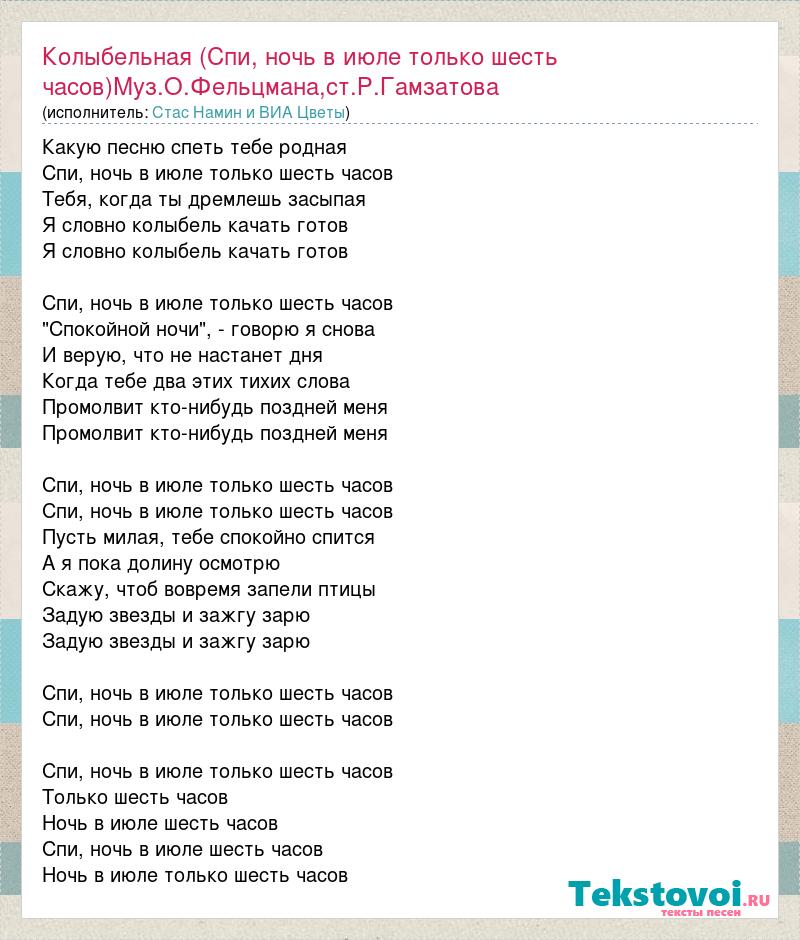 Главная→Исполнители→Стас Намин и ВИА Цветы→Колыбельная (Спи, ночь в июле только шесть часов)Муз.О.Фельцмана,ст.Р.Гамзат