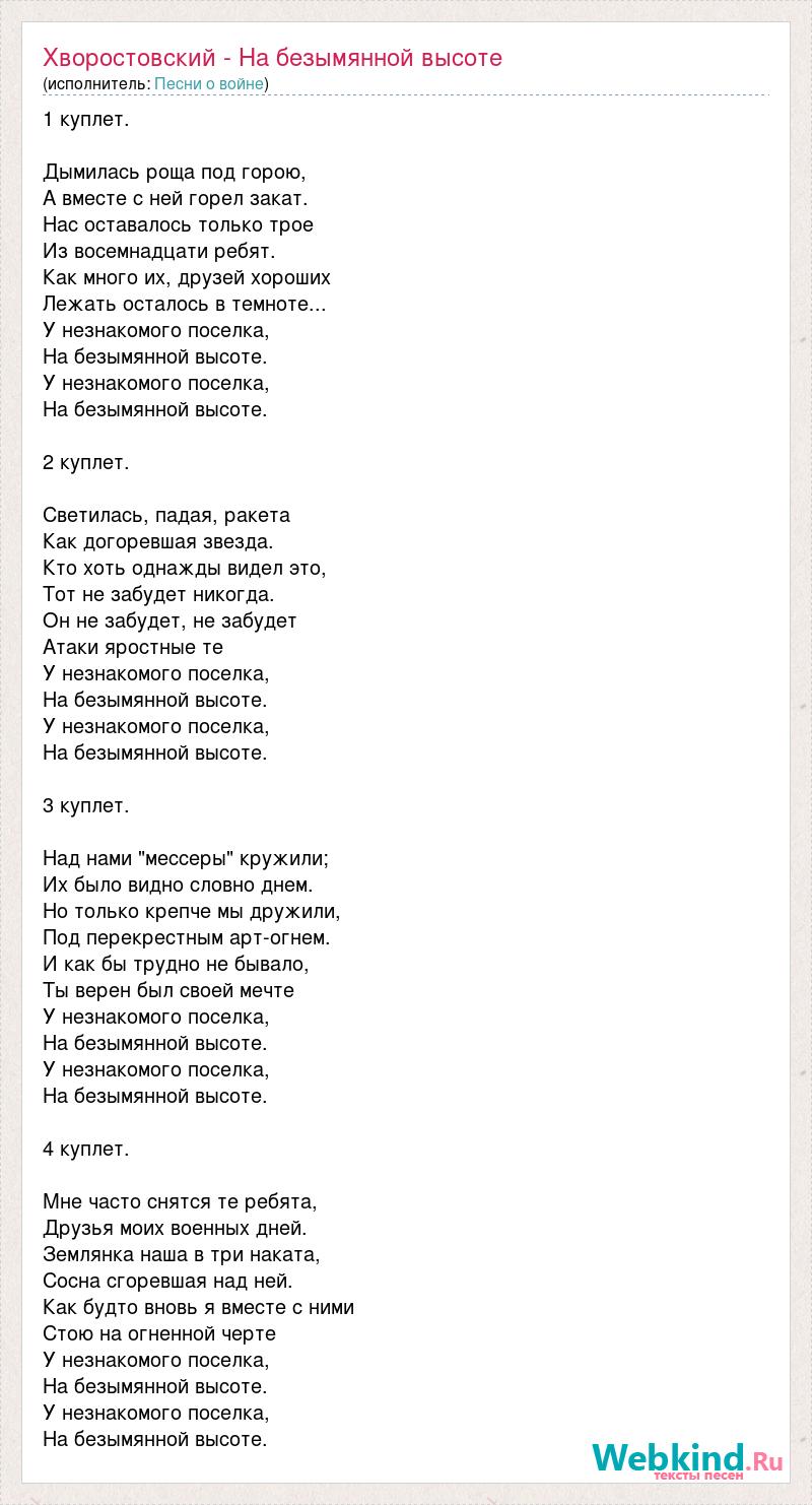 1 куплет. Дымилась роща под горою, А вместе с ней горел закат. Нас оставалось только трое Из восемнадцати ребят. Как много их, друзей хороших Лежать осталось в темноте... У незнакомого поселка, На безымянной высоте. У незнакомого поселка, На безымянной высоте. 2 куплет. Светилась, падая, ракета Как догоревшая звезда. Кто хоть однажды видел это, Тот не забудет никогда. Он не забудет, не забудет Атаки яростные те У незнакомого поселка, На безымянной высоте. У незнакомого поселка, На безымянной высоте. 3 куплет. Над нами "мессеры" кружили; Их было видно словно днем. Но только крепче мы дружили, Под перекрестным арт-огнем. И как бы трудно не бывало, Ты верен был своей мечте У незнакомого поселка, На безымянной высоте. У незнакомого поселка, На безымянной высоте. 4 куплет. Мне часто снятся те ребята, Друзья моих военных дней. Землянка наша в три наката, Сосна сгоревшая над ней. Как будто вновь я вместе с ними Стою на огненной черте У незнакомого поселка, На безымянной высоте. У незнакомого поселка, На безымянной высоте.