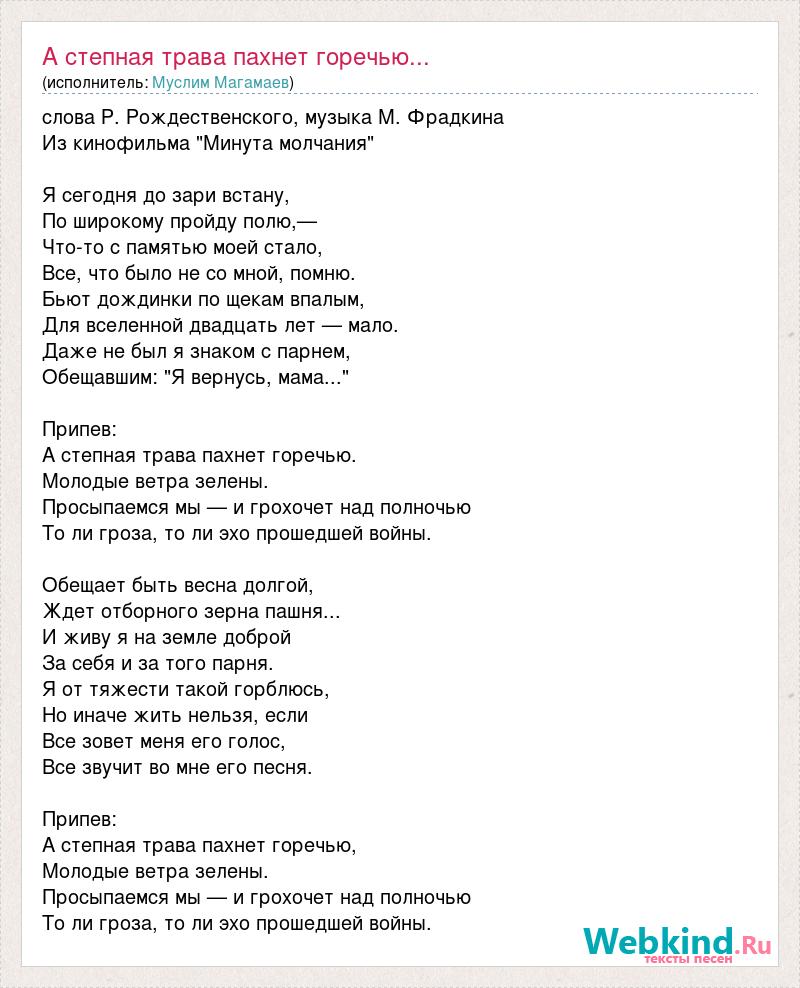 слова Р. Рождественского, музыка М. Фрадкина Из кинофильма "Минута молчания" Я сегодня до зари встану, По широкому пройду полю,— Что-то с памятью моей стало, Все, что было не со мной, помню. Бьют дождинки по щекам впалым, Для вселенной двадцать лет — мало. Даже не был я знаком с парнем, Обещавшим: "Я вернусь, мама..." Припев: А степная трава пахнет горечью. Молодые ветра зелены. Просыпаемся мы — и грохочет над полночью То ли гроза, то ли эхо прошедшей войны. Обещает быть весна долгой, Ждет отборного зерна пашня... И живу я на земле доброй За себя и за того парня. Я от тяжести такой горблюсь, Но иначе жить нельзя, если Все зовет меня его голос, Все звучит во мне его песня. Припев: А степная трава пахнет горечью, Молодые ветра зелены. Просыпаемся мы — и грохочет над полночью То ли гроза, то ли эхо прошедшей войны.
