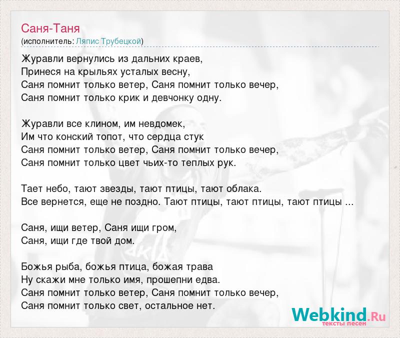 Журавли вернулись из дальних краев, Принеся на крыльях усталых весну, Саня помнит только ветер, Саня помнит только вечер, Саня помнит только крик и девчонку одну. Журавли все клином, им невдомек, Им что конский топот, что сердца стук Саня помнит только ветер, Саня помнит только вечер, Саня помнит только цвет чьих-то теплых рук. Тает небо, тают звезды, тают птицы, тают облака. Все вернется, еще не поздно. Тают птицы, тают птицы, тают птицы ... Саня, ищи ветер, Саня ищи гром, Саня, ищи где твой дом. Божья рыба, божья птица, божая трава Ну скажи мне только имя, прошепни едва. Саня помнит только ветер, Саня помнит только вечер, Саня помнит только свет, остальное нет.