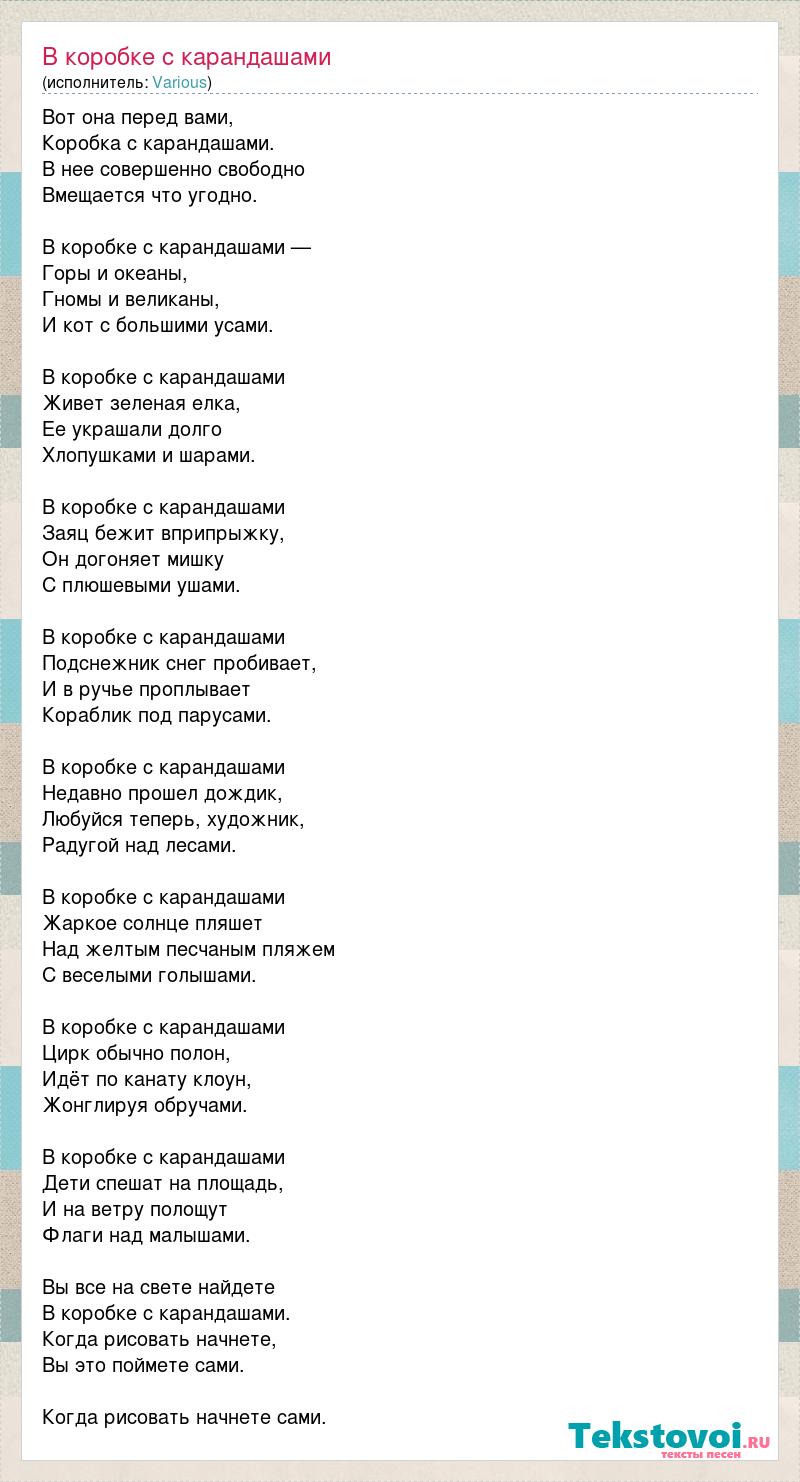 Вот она перед вами, Коробка с карандашами. В нее совершенно свободно Вмещается что угодно. В коробке с карандашами — Горы и океаны, Гномы и великаны, И кот с большими усами. В коробке с карандашами Живет зеленая елка, Ее украшали долго Хлопушками и шарами. В коробке с карандашами Заяц бежит вприпрыжку, Он догоняет мишку С плюшевыми ушами. В коробке с карандашами Подснежник снег пробивает, И в ручье проплывает Кораблик под парусами. В коробке с карандашами Недавно прошел дождик, Любуйся теперь, художник, Радугой над лесами. В коробке с карандашами Жаркое солнце пляшет Над желтым песчаным пляжем С веселыми голышами. В коробке с карандашами Цирк обычно полон, Идёт по канату клоун, Жонглируя обручами. В коробке с карандашами Дети спешат на площадь, И на ветру полощут Флаги над малышами. Вы все на свете найдете В коробке с карандашами. Когда рисовать начнете, Вы это поймете сами. Когда рисовать начнете сами.