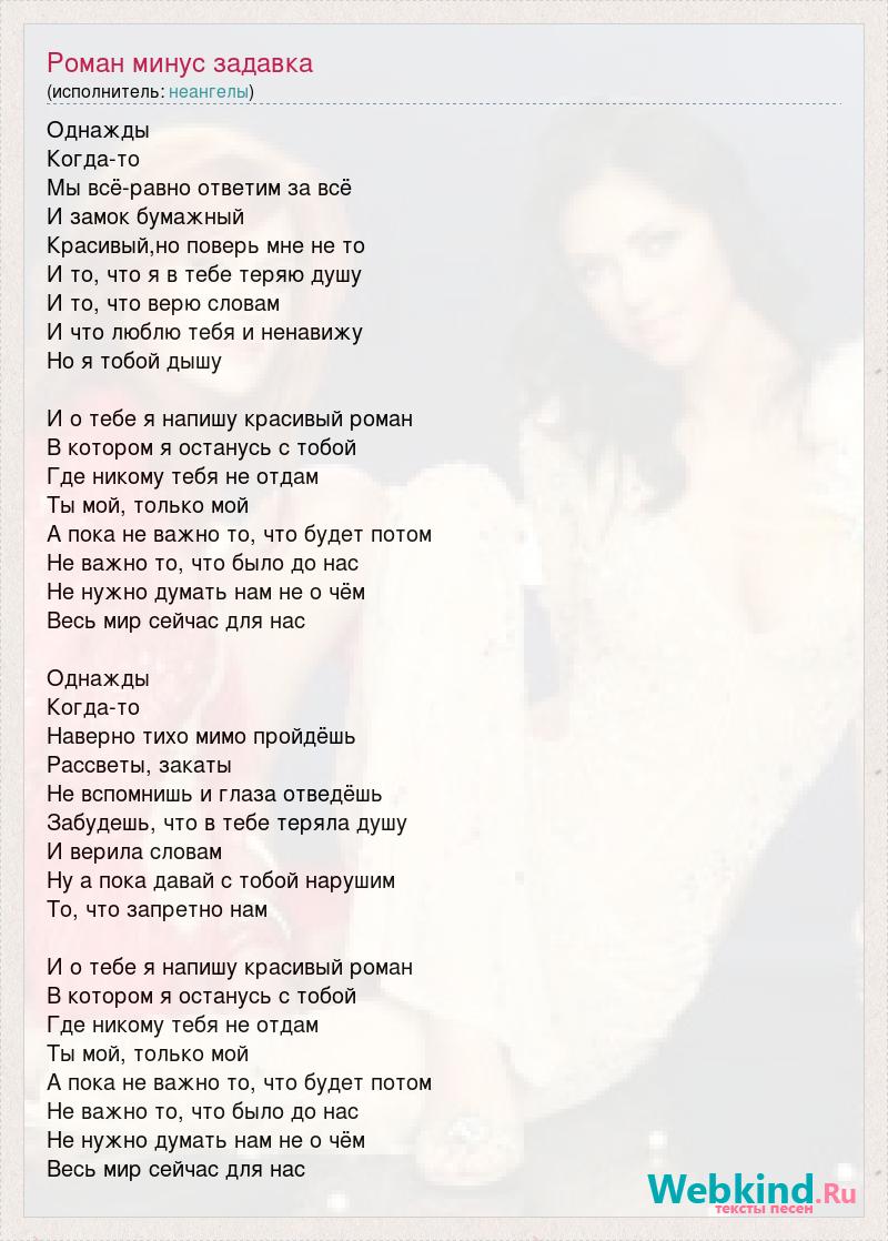 Однажды Когда-то Мы всё-равно ответим за всё И замок бумажный Красивый,но поверь мне не то И то, что я в тебе теряю душу И то, что верю словам И что люблю тебя и ненавижу Но я тобой дышу И о тебе я напишу красивый роман В котором я останусь с тобой Где никому тебя не отдам Ты мой, только мой А пока не важно то, что будет потом Не важно то, что было до нас Не нужно думать нам не о чём Весь мир сейчас для нас Однажды Когда-то Наверно тихо мимо пройдёшь Рассветы, закаты Не вспомнишь и глаза отведёшь Забудешь, что в тебе теряла душу И верила словам Ну а пока давай с тобой нарушим То, что запретно нам И о тебе я напишу красивый роман В котором я останусь с тобой Где никому тебя не отдам Ты мой, только мой А пока не важно то, что будет потом Не важно то, что было до нас Не нужно думать нам не о чём Весь мир сейчас для нас