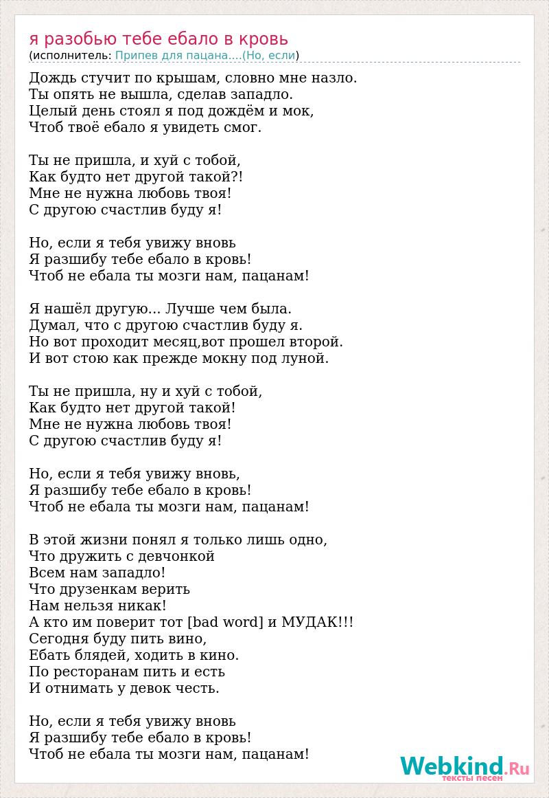 Дождь стучит по крышам, словно мне назло. Ты опять не вышла, сделав западло. Целый день стоял я под дождём и мок, Чтоб твоё ебало я увидеть смог. Ты не пришла, и хуй с тобой, Как будто нет другой такой?! Мне не нужна любовь твоя! С другою счастлив буду я! Но, если я тебя увижу вновь Я разшибу тебе ебало в кровь! Чтоб не ебала ты мозги нам, пацанам! Я нашёл другую... Лучше чем была. Думал, что с другою счастлив буду я. Но вот проходит месяц,вот прошел второй. И вот стою как прежде мокну под луной. Ты не пришла, ну и хуй с тобой, Как будто нет другой такой! Мне не нужна любовь твоя! С другою счастлив буду я! Но, если я тебя увижу вновь, Я разшибу тебе ебало в кровь! Чтоб не ебала ты мозги нам, пацанам! В этой жизни понял я только лишь одно, Что дружить с девчонкой Всем нам западло! Что друзенкам верить Нам нельзя никак! А кто им поверит тот [bad word] и МУДАК!!! Сегодня буду пить вино, Ебать блядей, ходить в кино. По ресторанам пить и есть И отнимать у девок честь. Но, если я тебя увижу вновь Я разшибу тебе ебало в кровь! Чтоб не ебала ты мозги нам, пацанам!
