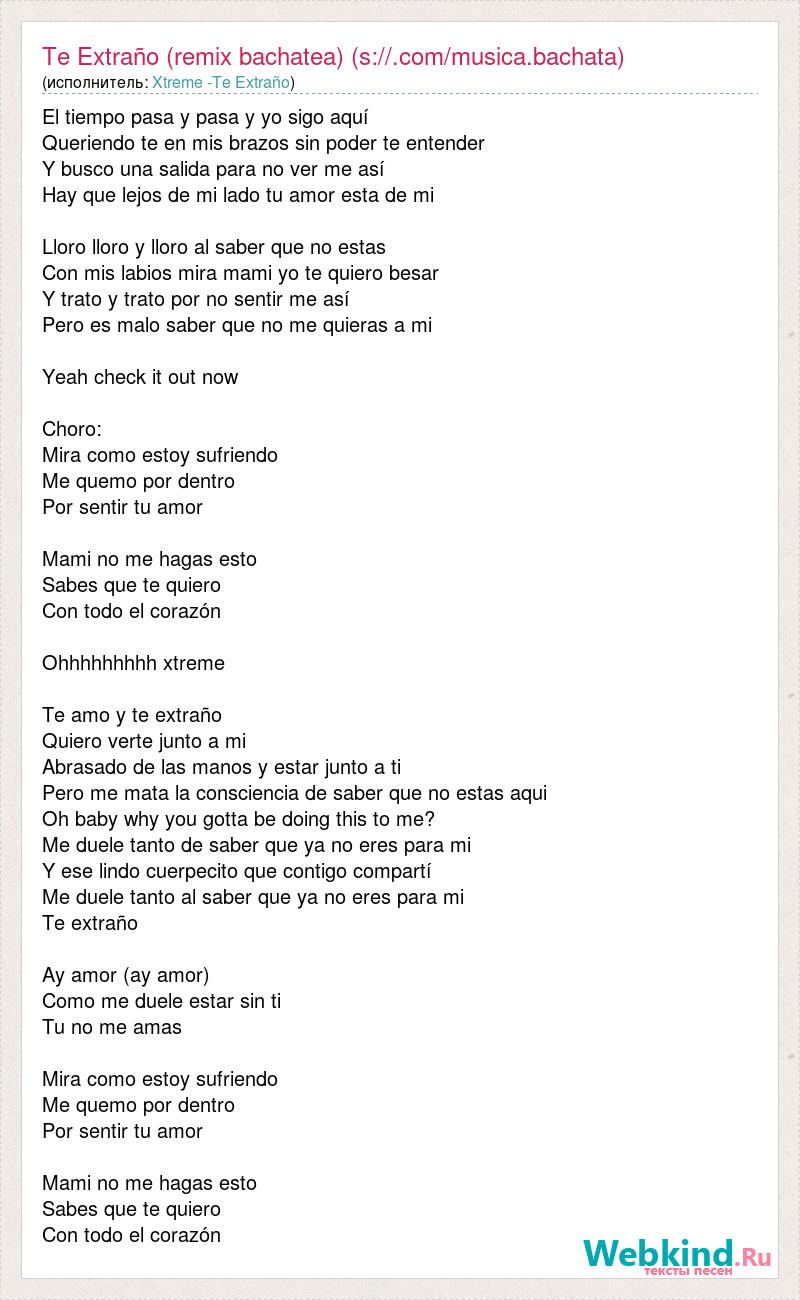 El tiempo pasa y pasa y yo sigo aquí Queriendo te en mis brazos sin poder te entender Y busco una salida para no ver me así Hay que lejos de mi lado tu amor esta de mi Lloro lloro y lloro al saber que no estas Con mis labios mira mami yo te quiero besar Y trato y trato por no sentir me así Pero es malo saber que no me quieras a mi Yeah check it out now Choro: Mira como estoy sufriendo Me quemo por dentro Por sentir tu amor Mami no me hagas esto Sabes que te quiero Con todo el corazón Ohhhhhhhhh xtreme Te amo y te extraño Quiero verte junto a mi Abrasado de las manos y estar junto a ti Pero me mata la consciencia de saber que no estas aqui Oh baby why you gotta be doing this to me? Me duele tanto de saber que ya no eres para mi Y ese lindo cuerpecito que contigo compartí Me duele tanto al saber que ya no eres para mi Te extraño Ay amor (ay amor) Como me duele estar sin ti Tu no me amas Mira como estoy sufriendo Me quemo por dentro Por sentir tu amor Mami no me hagas esto Sabes que te quiero Con todo el corazón