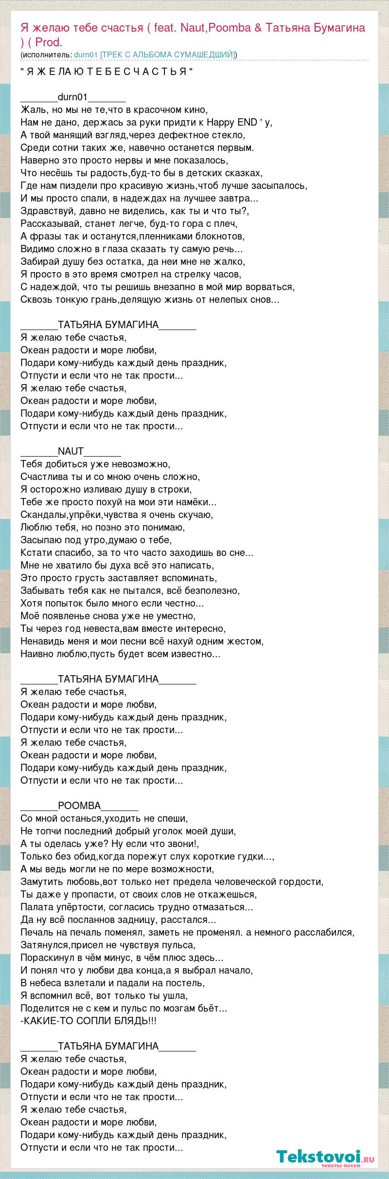 Главная→Исполнители→Durn01 [ТРЕК С АЛЬБОМА СУМАШЕДШИЙ]→Я желаю тебе счастья ( feat. Naut,Poomba & Татьяна Бумагина ) ( Prod. by.