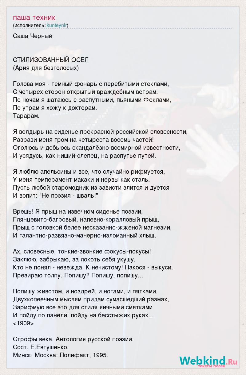 Саша Черный СТИЛИЗОВАННЫЙ ОСЕЛ (Ария для безголосых) Голова моя - темный фонарь с перебитыми стеклами, С четырех сторон открытый враждебным ветрам. По ночам я шатаюсь с распутными, пьяными Феклами, По утрам я хожу к докторам. Тарарам. Я волдырь на сиденье прекрасной российской словесности, Разрази меня гром на четыреста восемь частей! Оголюсь и добьюсь скандалёзно-всемирной известности, И усядусь, как нищий-слепец, на распутье путей. Я люблю апельсины и все, что случайно рифмуется, У меня темперамент макаки и нервы как сталь. Пусть любой старомодник из зависти злится и дуется И вопит: "Не поэзия - шваль!" Врешь! Я прыщ на извечном сиденье поэзии, Глянцевито-багровый, напевно-коралловый прыщ, Прыщ с головкой белее несказанно-жженой магнезии, И галантно-развязно-манерно-изломанный хлыщ. Ах, словесные, тонкие-звонкие фокусы-покусы! Заклюю, забрыкаю, за локоть себя укушу. Кто не понял - невежда. К нечистому! Накося - выкуси. Презираю толпу. Попишу? Попишу, попишу... Попишу животом, и ноздрей, и ногами, и пятками, Двухкопеечным мыслям придам сумасшедший размах, Зарифмую все это для стиля яичными смятками И пойду по панели, пойду на бесстыжих руках... <1909> Строфы века. Антология русской поэзии. Сост. Е.Евтушенко. Минск, Москва: Полифакт, 1995.